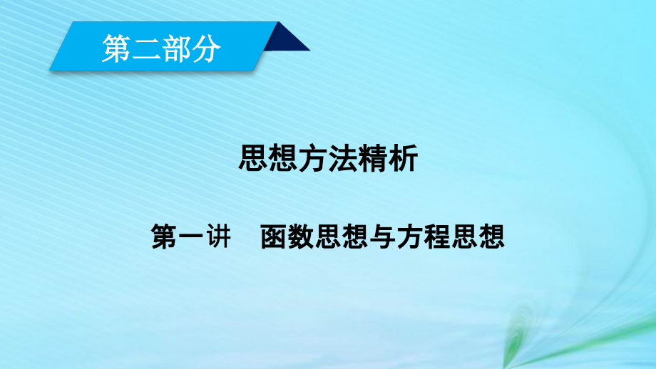单击此处编辑母版文本样式,第二部分,思想方法精析,第一讲,函数,思想与方程思想,1,核心知识整合,2,命题热点突破,核心知识整合,一、函数思想,就是用运动和变化的观点,分析和研究具体问题中的数量关系,并用函数的解析式将其表示出来,从而通过研究函数的图象和性质,使问题获解,二、方程思想,就是分析数学中的变量间的等量关系,构建方程或方程组,转化为对方程的解的讨论,从而使问题获解,命题热点突破,命题方向,1,函数与方程思想在不等式中的应用,D,规律总结,函数与方程思想在不等式问题中的应用要点,(1),在解决不等式恒成立问题时,一种最重要的思想方法就是构造适当的函数,然后利用函数的最值解决问题,(2),要注意在一个含多个变量的数学问题中,需要确定合适的变量和参数,从而揭示函数关系,使问题更明朗化一般地,已知范围的量为变量,而待求范围的量为参数,B,C,命题方向,2,解决图象交点或方程根的问题,规律总结,利用函数与方程思想解决交点及根的问题的思路,(1),应用方程思想把函数图象交点问题转化为方程根的问题,应用函数思想把方程根的问题转论为函数零点问题,(2),含参数的方程问题一般通过直接构造函数或分离参数化为函数解决,C,命题方向,3,解决最值或参数范围问题,D,规律总结,求最值或参数范围的技巧,(1),充分挖掘题设条件中的不等关系,构建以待求字母为元的不等式,(,组,),求解,(2),充分应用题设中的等量关系,将待求参数表示成其他变量的函数,然后应用函数知识求解,(3),当问题中出现两数积与这两数和时,是构建一元二次方程的明显信息,构造方程再利用方程知识使问题巧妙解决,(4),当问题中出现多个变量时,往往要利用等量关系去减少变量的个数,B,命题方向,4,函数与方程思想在解析几何中的应用,规律总结,利用判别式法研究圆锥曲线中的范围问题的步骤,第一步:联立方程,第二步:求解判别式,.,第三步:代换利用题设条件和圆锥曲线的几何性质,得到所求目标参数和判别式不等式中的参数的一个等量关系,将其代换,第四步:下结论将上述等量代换式代入,0,或,0,中,即可求出目标参数的取值范围,B,