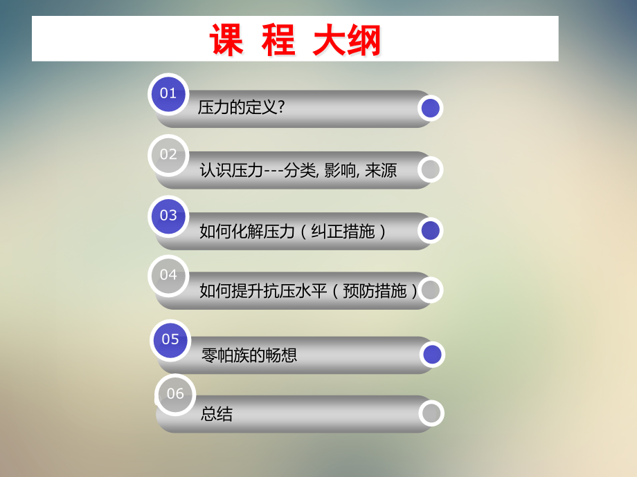 单击此处编辑母版标题样式,单击此处编辑母版文本样式,第二级,第三级,第四级,第五级,2020/8/9 Sunday,#,2025/6/7 周六,如何管理压力,压力的定义?,01,认识压力-分类,影响,来源,02,如何化解压力(纠正措施),03,如何提升抗压水平(预防措施),04,零帕族的畅想,05,课 程 大纲,04,总结,06,单元一:什么是压力,压力定义,压力是由于事件和责任超出个人应对能力范围时所产生的焦虑状态,压力研究专家Richard Lazarus,压力就是负荷超载,单元二:认识压力,压力的基本认识,一种无形的力量;,一种精神或心理层面的力量;,会导致心理上和社会适应方面不健康,进而影响生理健康;,压力相伴我们一生;,压力对于不同的人产生的作用是不同的,压力是可以管理的,(1)依压力事件的性质分类,1.正面事件压力:,所谓正面事件压力,是指产生压力反应的压力源是美好的或令人羨慕的事件。,2.负面事件压力:,所谓负面事件压力,是指产生压力反应的压力源是不好的事件。,(2)依压力的轻重分类,轻压力:,中压力:,重压力:,(3)、压力的双重作用,压力像“糖精”,压力像“香料”,适度的压力是生活的动力,太多的压力却会使人崩溃。,有压力才有动力,“有压力才有动力”,绩,效,压力,适度的压力,可以产生动力;,可以产生凝聚力;,可以增强自信心;,可以丰富自己的精神生活;,可以提高自己解决问题的能力;,压力都能变成动力吗?,“有压力才有动力”,绩,效,压力,压力过大绩效下降,过度压力对工作的影响,工作效率降低,对工作缺乏兴趣,与上下级或同事关系不良,工作失误增加,有非疾病导致的缺勤增加,病假次数增加,吸烟或饮酒量的增加,脾气暴躁、易怒,失眠或其他睡眠问题,消极情绪产生,生理疾病出现(如肠胃病),与伴侣关系不良、与子女关系不良,过度压力对生活的影响,心跳加快,呼吸急促,血压升高,满头大汗,肌肉紧张,吃不下饭,睡不好觉,身心疲惫,心慌,胸闷,常常叹气,高血压,多汗,偏头痛、颈椎痛,慢性胃炎、胃溃疡,失眠、多梦、恶梦,压抑、神经衰弱,高血压,冠心病,颈椎痛,糖尿病,慢性胃炎,胃溃疡,失眠症,抑郁症,与压力,有关的,疾病,焦虑,疲倦,抑郁,(4)过度压力产生的因素,个体的承受能力:,性格、心胸、见识、阅历、受教育程度、价值观、责任心等等。,压力的大小,压力源的多少,压力的时间长短,压力源,外,内,环境,性格,(5)过度压力的来源,工作,生活,外界压力-环境,自然灾害,如地震,水灾,旱灾等;,天气,如阴雨天,酷暑,沙尘暴等;,环境污染,如雾霾,空气污染,水污染等;,社会问题,如政治动乱,经济危机,社会治安问题,养老问题,歧视,通货膨胀,医疗保障问题,食品安全问题,交通拥堵等,.,关键词:环境越来越差!,外界压力-工作,超负荷的工作、人际关系不好,难以实现的目标、强硬的上级、下级不服从指挥、受到批评、绩效差、做自己不擅长的工作、工作技能不够、与上级沟通问题,工资低、下岗失业、上岗择业、工作调动、地位变化、报酬的变化,复杂的人际关系、压抑的工作氛围、消极的同事,关键词:工作压力山大!,外界压力-生活,个人的:人际关系、债务、怀孕、睡眠、生病、肥胖、衰老等,家庭的:结婚、生育、孩子教育、离婚、家庭关系、婚外恋、家庭暴力、家庭成员生老病死等,其他:纠纷、人情往来、购房购车等,关键词:生活处处有压力!,内在压力:A型性格导致压力,成就动机高,竞争意识强,期望值高,不知满足,严格要求自己,不惜代价实现目标,追求效率,工作努力,以事业成功为人生价值唯一评判标准,时间紧迫感强,成天忙忙碌碌,急躁易怒,不懂得放松自己,统计表明,85%的心血管病与A型行为有关,在心脏病患者中,A型患者达98%,心脏冠状动脉硬化患者中,A型性格是B型性格的五倍以上.,彭作义-56岁,青岛啤酒总经理,心脏病突发,杨迈54岁,爱立信中国总裁,心脏病突发,张生瑜-39岁,北京同仁堂董事长,心脏病突发,B型性格特点,B型性格表现为:,1,从来不曾有时间上的紧迫感以及其他类似的不适感;,2,认为没有必要表现或讨论自己的成就和业绩,除非环境要求如此;,3,充分享受娱乐和休闲时光,而不是不惜一切代价表现自己的最佳水平;,4,充分放松而不感到愧疚。,1.晚上我入睡困难。,是,否,2.我肌肉紧张,或有偏头痛。,是,否,3.我担心自己的收入,怕收支失衡。,是,否,4.我觉得不能集中精力专心做事,是,否,5.我经常因为工作不吃早饭、午餐或晚餐。,是,否,6.我觉得与人交际应酬变得很不起劲。,是,否,7.我觉得电视上的综艺节目越来越无聊,是,否,8.最近我失去了一位朋友或家人。,是,否,9.最近我的恋爱或婚姻遇到了麻烦。,是,否,10.即使到了度假胜地,依旧没有很开心的感觉。,是,否,压力测试,压力测试,11.我对自己的人生没有清晰的意义和目标。,是,否,12.与人倾谈时,我常打断对方的话题,是,否,13.我有胃痛或其他慢性疼痛。,是,否,14.我没有很亲密的朋友圈子。,是,否,15.我没有定期锻炼的习惯。,是,否,16.我需要借烟酒、药物、零食等抑制不安的情绪,是,否,17.我在性的问题上有些困扰。,是,否,18.我的家庭关系不尽人意。,是,否,19.我有些自卑。,是,否,20.我没有时间静下心来冥想或内省。,是,否,5-10分,中度,5分,较低,11-15分,较高,15分,极高,你的压力怎么样?,压力测试趣图,压力过大,怎么办?,单元三:化解压力,化解压力的方法,降龙十八掌法(解决法),关键词:正视问题,不逃避,评估问题;,把问题写下来,尽量写详细些.,范例:,钱包丢了,