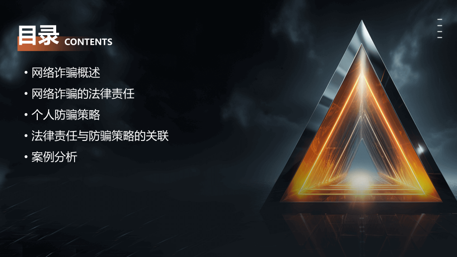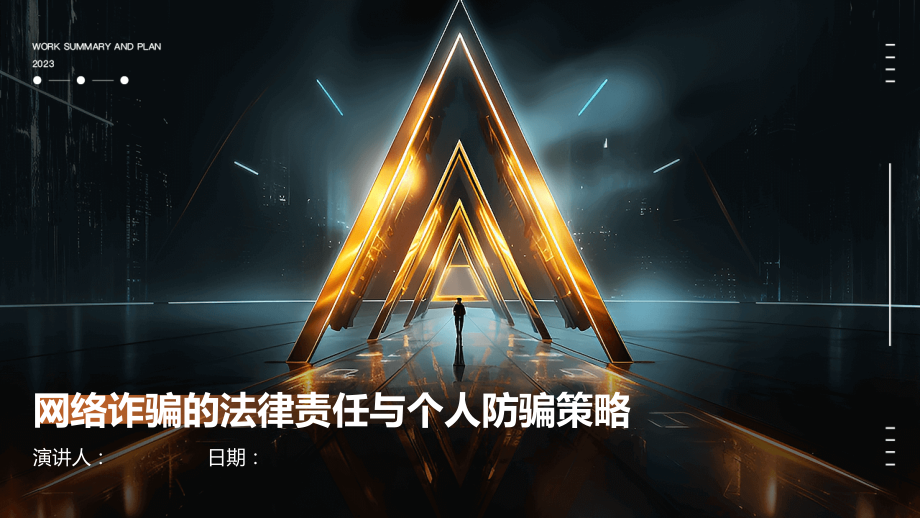 Click to edit Master title style,Click to edit Master text styles,Second level,Third level,Fourth level,Fifth level,8/1/2011,#,网络诈骗的法律责任与个人防骗策略,演讲人:,日期:,目录,CONTENTS,网络诈骗概述,网络诈骗的法律责任,个人防骗策略,法律责任与防骗策略的关联,案例分析,01,网络诈骗概述,网络诈骗是指利用互联网技术,通过虚假信息、欺诈手段骗取他人财物的行为。,定义,网络诈骗具有跨地域性、匿名性、高科技性等特点,使得诈骗行为更加难以防范和打击。,特点,定义与特点,网络诈骗往往导致受害人财产损失,甚至倾家荡产。,财产损失,隐私泄露,社会信任危机,诈骗分子常常获取受害人的个人信息,进而实施更严重的犯罪行为。,网络诈骗的频发导致社会信任度降低,影响人们的日常生活和经济发展。,03,02,01,网络诈骗的危害,现状,网络诈骗案件数量逐年上升,诈骗手段不断翻新,涉及的金额也越来越巨大。,趋势,随着互联网的普及和技术的进步,网络诈骗将更加猖獗,未来可能出现更多新型的网络诈骗手段。同时,跨国网络诈骗也将成为一个新的趋势,给打击网络诈骗带来更大的挑战。,网络诈骗的现状与趋势,02,网络诈骗的法律责任,诈骗罪的定罪与量刑,网络诈骗行为符合诈骗罪的构成要件时,依法应以诈骗罪定罪处罚。根据诈骗数额和情节严重程度,可分别处以拘役、有期徒刑、无期徒刑等刑罚,并处罚金或没收财产。,涉及计算机犯罪的刑事责任,网络诈骗行为可能同时触犯计算机犯罪相关罪名,如非法侵入计算机信息系统罪、破坏计算机信息系统罪等。根据具体行为和后果,可依法追究相应的刑事责任。,刑事责任,网络诈骗行为侵害他人合法权益的,依法应承担侵权责任。包括停止侵害、消除影响、赔礼道歉、赔偿损失等。,网络诈骗行为涉及合同违约的,依法应承担违约责任。根据合同约定和法律规定,违约方需向守约方支付违约金、赔偿金等。,民事责任,合同违约责任,侵权责任,网络诈骗行为违反行政管理法规的,依法应受到行政处罚。包括警告、罚款、没收违法所得、责令停业整顿、吊销营业执照等。,行政处罚,相关行政部门可采取一系列监管措施,如加强网络监管、完善法律法规、提高公众防范意识等,以预防和打击网络诈骗行为。,行政监管措施,行政责任,03,个人防骗策略,对于来自陌生人的电子邮件、短信、电话等,要保持警惕,不要轻易相信其中的内容。,不要随意点击来自陌生人的链接或下载附件,以防恶意软件入侵或个人信息泄露。,在进行网上交易或投资时,要仔细核实对方身份和信息,选择正规平台和渠道。,提高警惕,不轻信陌生人,定期更换密码,并避免使用简单密码或生日等容易被猜到的信息作为密码。,安装防病毒软件和防火墙,及时更新操作系统和软件补丁,以防黑客攻击和恶意软件入侵。,不要随意透露自己的身份证号码、银行卡号、密码等敏感信息。,保护个人信息,避免泄露,了解常见的网络诈骗手段,如钓鱼网站、虚假购物网站、网络传销等。,学会识别虚假信息和诈骗邮件的特征,如包含错别字、语法错误、威胁恐吓等。,对于可疑的邮件、短信或电话,可以通过官方渠道核实信息真伪,或者向相关部门举报。,学会识别网络诈骗手段,04,法律责任与防骗策略的关联,了解国家关于网络诈骗的法律法规,明确网络诈骗行为的法律责任。,学习相关法律法规,树立正确的法律观念,认识到网络诈骗行为的严重性和危害性。,增强法律意识,时刻保持警惕,不轻信陌生人的信息和承诺,避免陷入网络诈骗的陷阱。,提高警惕性,了解法律责任,提高防骗意识,不随意透露个人信息,特别是银行账户、密码、身份证等敏感信息。,保护个人信息,不轻易点击陌生链接,避免下载不明来源的软件或插件。,谨慎对待陌生链接,在涉及资金交易等重要事项时,要通过多种渠道核实信息的真实性。,多方核实信息,掌握防骗策略,减少被骗风险,03,二者相互促进,加强法律责任意识和提高防骗能力相辅相成,共同构建安全、和谐的网络环境。,01,法律责任是防骗策略的基础,了解法律责任有助于制定有效的防骗策略,避免触犯法律。,02,防骗策略是法律责任的补充,掌握防骗策略可以降低被骗风险,减少因网络诈骗而承担法律责任的可能性。,法律责任与防骗策略的互动关系,05,案例分析,网络诈骗案例介绍,案例一,虚假购物网站诈骗。诈骗分子通过搭建虚假购物网站,以低价销售商品为诱饵,骗取受害人的钱财。,案例二,冒充公检法诈骗。诈骗分子冒充公检法机关工作人员,以涉嫌洗钱、个人信息泄露等为由,骗取受害人的财产。,案例三,网络投资诈骗。诈骗分子通过虚假投资平台或项目,承诺高回报低风险,吸引受害人投资,最终卷款跑路。,网络诈骗行为侵犯了他人的财产权益,依法应承担民事责任,包括返还财产、赔偿损失等。,民事责任,网络诈骗行为违反了行政管理法规,相关行政机关可依法对行为人进行行政处罚,如罚款、吊销营业执照等。,行政责任,网络诈骗行为构成犯罪的,依法应追究刑事责任。我国刑法规定了诈骗罪、合同诈骗罪等相关罪名,根据犯罪情节和后果的严重程度,可判处相应的刑罚。,刑事责任,法律责任分析,提高警惕,保护个人信息,核实信息,及时报警,个人防骗策略应用,01,02,03,04,不轻信陌生人的话语,不随意点击不明链接或下载不明文件。,不轻易透露个人信息,如身