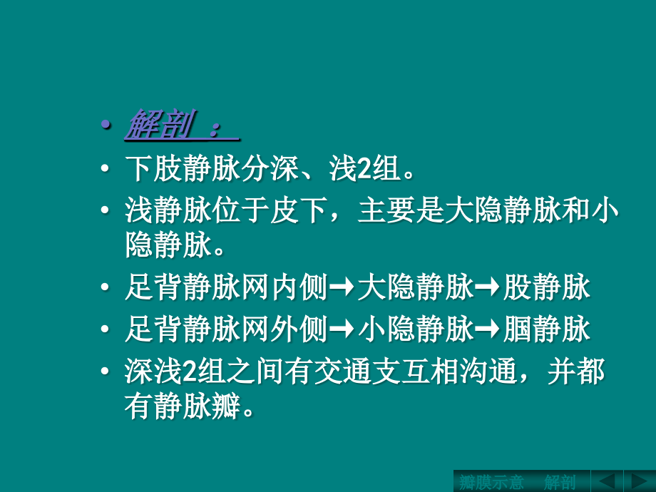 单击此处编辑母版标题样式,单击此处编辑母版文本样式,第二级,第三级,第四级,第五级,*,*,第七章,循环系统疾病病人的护理,第七节,单纯性下肢静脉曲张,病人的护理,(P,286,),解剖:,下肢静脉分深、浅,2,组。,浅静脉位于皮下,主要是大隐静脉和小隐静脉。,足背静脉网内侧大隐静脉股静脉,足背静脉网外侧小隐静脉腘静脉,深浅,2,组之间有交通支互相沟通,并都有静脉瓣。,解剖,瓣膜示意,单纯性下肢静脉曲张:,是指下肢浅静脉因血液回流障碍而引起的静脉迂曲和扩张。,病因:,1.,先天性静脉壁软弱或瓣膜缺陷。,2.,静脉内压力增高,病理:,下肢血液回流障碍下肢浅静脉代偿性曲张肢体肿胀、皮肤营养障碍等皮肤湿疹、溃疡甚至癌变。,下肢静脉曲张示意,解剖,瓣膜示意,治疗原则:,1.,非手术治疗,控制病因,积极消除诱因。,抬高患肢,使用弹力绷带或穿医用弹力袜。,硬化剂注射治疗。,2.,手术治疗,静脉高位结扎术或曲张静脉分段剥脱术。,癌变者:溃疡广泛切除,+,植皮术或截肢术。,下肢静脉曲张示意,解剖,瓣膜示意,静脉高位结扎术,曲张静脉剥脱术,护理评估,一、致病因素,1.,与遗传有关的先天性静脉壁薄弱或静脉瓣膜发育异常是主要的致病因素。,2.,诱因:久站久坐,重体力劳动等。,3.,其他:妊娠,慢性咳嗽,慢性便秘,盆腔肿瘤等。,二、身心状况,下肢疲劳、沉重、酸胀、或疼痛。,小腿部浅静脉曲张、隆起、弯曲、蜿蜒成团似蚯蚓状。,下肢静脉曲张示意,解剖,瓣膜示意,易出现血栓性静脉炎和蜾部水肿。,小腿部皮肤萎缩、干燥、毛发脱落、色素沉着、瘙痒、湿疹样改变、经久不愈的溃疡等。,大出血。,恶变。,常用检查方法:,1.,深静脉通畅试验,(,Perthes,试验,),2.,大隐静脉及交通支瓣膜功能试验,(,Brodie Trendelenburg,试验,),Perthes,试验,下肢静脉曲张示意,解剖,瓣膜示意,Brodie Trendelenburg,试验,三、实验室检查,下肢静脉压测定,静脉造影,彩色,B,超等。,护理诊断及合作性问题,1.,舒适的改变,2.,皮肤完整性受损,依据:湿疹、溃疡,(,或有皮肤完整性受损的危险,),3.,组织灌注量改变,4.,潜在并发症:,湿疹、溃疡、大出血、癌变;术后伤口出血或感染、深静脉血栓形成等。,下肢静脉曲张示意,解剖,瓣膜示意,护理措施,一、非手术治疗的护理,1.,指导病人正确使用弹力绷带或穿医用弹力袜。,2.,避免久站久坐,安排适当运动。,3.,注意休息,抬高患肢。,二、围手术期处护理,1.,手术前护理,(1),严格备皮:,范围要广,需按患侧腹股沟手术备皮范围并包括同侧整个下肢,直达足趾。需植皮时,还应做好供皮区皮肤准备。,(2),并发慢性溃疡者:,应加强换药,术前,2,3,天用,70%,酒精擦拭周围皮肤,每日,1,2,次。,(3),抬高患肢。,(4),测定血常规,出凝血时间,凝血酶原时间。,2.,手术后护理,(1),加强病情观察:,术后,24,小时内注意生命征的变化,经常查看手术切口敷料,了解切口渗血、出血情况。,观察肢体有无肿胀、疼痛,注意远端肢体的感觉、温度、颜色、运动等情况。,如体温升高应注意有无切口感染和静脉炎的发生。,(2),弹力绷带包扎的护理:,包扎时应从远到近,松紧适宜。,注意观察肢端的皮肤色泽、患肢肿胀情况。,硬化剂治疗局部包扎即可,维持,3,6,周;大隐静脉剥脱术后,从足趾至腹股沟部位均匀包扎,维持,2,3,周。,(3),术后患肢抬高,15,20cm.,(4),术后早期活动,,24,48,小时后下床活动。,思考题,第八节,原发性下肢深静脉瓣膜,关闭不全病人的护理,(P,290,),病理:,下肢深静脉瓣膜关闭不全下肢深静脉高压逆流通过交通支逆流入浅静脉继发性下肢浅静脉曲张。,病因:,1.,与遗传有关的先天性静脉壁软弱或瓣膜缺陷。,2.,腹内压力增高,(,本节其余内容自学,),第九节,血栓闭塞性脉管炎,病人的护理,(P,291,),血栓闭塞性脉管炎:,是一种以周围血管非化脓性炎症和闭塞为特点的疾病。,累及四肢远端中、小动脉和伴行的静脉。,北方多见。,病理:,血管全层非化脓性炎症,早期即有血栓形成缺血性疼痛、功能障碍和肢体组织营养障碍肢体远端坏疽和溃疡。,治疗原则:,无特效治疗方法。,护理评估,一、致病因素,病因不清。,与寒冷、吸烟、慢性损伤、感染等有关,。,二、身心状况,1.,身体表现,(1),局部缺血期:,间歇性跛行。,(2),营养障碍期:,静息痛,,夜间尤甚。,(3),组织坏死期:,患肢末端干性坏疽经久不愈的溃疡继发感染湿性坏疽。,2.,心理状态,三、实验室及其他检查,彩色,B,超、动脉造影等。,护理诊断及合作性问题,1.,疼痛,2.,皮肤完整性受损,依据:坏疽、溃疡,(,或有皮肤完整性受损的危险,),3.,外周组织灌注量改变,4.,知识缺乏,5.,焦虑或悲哀,护理措施,1.,心理护理,2.,建议戒烟,3.,指导病人进行,Buerger,活动:,平卧,抬高患肢,45,,维持,1,2,分钟双足下垂床边,2,3,分钟,同时作踝及趾的伸屈运动再将患肢平放休息,2,3,分钟。如此反复,4,5,次,每日,3,4,次。,4.,防寒保暖,但不能局部加温;保持清洁、干燥,防治感染和外伤。,5.,测皮温,观察疗效。,6.,手术后护理,(1),静脉手术后抬高患肢;动脉手术后患肢平放。静脉重建术后卧床制动,1,周;动脉重建术后卧床制动,2,周。,(2),血管重建术后,需以,观察患肢远端的皮肤温度、感觉、色泽、脉搏强度等。,(3),截肢术后,注意防治出血和感染。,思考题,思考题:,下列说法是否正确,并说明理由:,1.,下肢静脉曲张病变的实质是静脉瓣膜功能不全。,2.,深静脉功能试验对选择静脉曲张的手术方式有重要意义。,3.,对合并下
