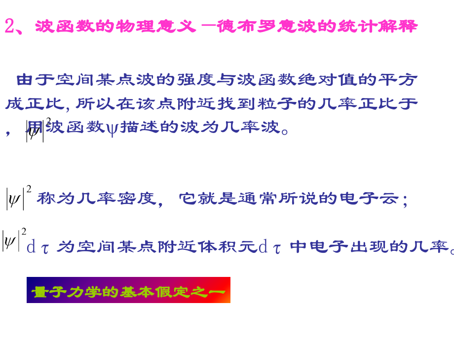 单击此处编辑母版标题样式,单击此处编辑母版文本样式,第二级,第三级,第四级,第五级,*,第二节 量子力学基本原理,2、波函数的物理意义德布罗意波的统计解释,称为几率密度,它就是通常所说的电子云;,d为空间某点附近体积元d中电子出现的几率。,由于空间某点波的强度与波函数绝对值的平方成正比,所以在该点附近找到粒子的几率正比于 ,用波函数描述的波为几率波。,量子力学的基本假定之一,(1)合格波函数的条件,a、,必须是连续的;,b、,必须是单值的;,c、,必须是有限的。,3、波函数的性质,一般为复数形式:fig,f和g均为坐标的实函数。的共轭复数*fig,*f,2,g,2,,因此*是实函数,且为正值。为书写方便,常用,2,代替*。,(2)C,和描写同一状态(,C为常数),(3)波函数的归一化,对于未归一化的波函数,粒子出现在,d内的几率与*d,成正比,粒子出现在空间某点的几率密度与*成正比;,若是归一化的定态波函数,*d表示粒子出现在d内,的几率,*是粒子出现在空间某点的几率密度。,通常用归一化的波函数描述微观粒子的运动状态。即在整个空间找到粒子的几率是100%.,如果波函数 未归一化,可乘上一个合适的系数 c 使它归一化。,归一,=,c,未归一化,(C为归一化系数),二、实物微粒的运动规律,Schrdinger方程,1、定态,Schrdinger方程,对三维空间内任意方向上运动的粒子,则:,上式两侧对x,y,z两次求偏导,得:,将三式相加,并乘以1/2m,得:,量子力学证明,对受力场V作用的粒子可得:,(拉普拉斯算符),这就是著名的定态,Schr,dinger方程,用它来描述,微观粒子运动的稳定态,上式两侧各加上V(x,y,z),,,粒子总能量的平均值,对定态而言,粒子的总能量必定是守恒的,为一与位置无关的常数。,Schrdinger方程的物理意义:,2、含时,Schrdinger方程,对于一个质量为m,在势能为V的场中运动的微粒来说,其每一个定态可用满足这个方程的合理解的波函数,来描述,与每一个相应的常数E就是微粒处在该定态时的总能量。,量子力学的基本假定之二,三、定态Schrdinger方程的算符表达式,力学量:,力学中能用实验仪器观察得到的物理量,,如:E、P、M,它们都是坐标和动量的函数。,1、算符和力学量的算符表示,算符:,指对一个函数施行某种运算(或动作)的符,号,如:+、-、。,线性算符:,(,1,2,),1,2,,,为线性算符。,厄,米,算符:,1,*,1,d,1,(,1,)*d或,1,*,2,d,2,(,1,)*d,exp-ix(,id/dx,)expixdxexp-ix(-expix)dx-x.,expix (,id/dx,)expix *dxexpix(-expix)*dx-x.,1*,1 d1(,1)*d,是厄米算符,例:,id/dx,,1,expix,,1,*exp-ix,,是厄米算符吗?,量子力学中,微观体系的每个力学量,都对应着一个线性厄,米,算符,量子力学的基本假定之三,力学量,算符,力学量,算符,位置 x,势能 V,动量的x轴分量p,x,动能T=p,2,/2m,角动量的z轴分量M,z,xp,y,yp,x,总能量,E=T+V,力学量与算符的对应关系如下表,:,2、能量算符的本征方程、本征值和本征函数,若上式中f,2,等于一个常数a乘以f,1,本身,那么称f,1,为本征函数,常数称为与f,1,对应的本征值,而把方程称为本征方程。,一个算符作用于一个函数f,1,得到的将是另一个函数f,2,,本征函数,本征值,量子力学的基本假定之四,(a)e,imx,(b)sinx (c)x,2,+y,2,(d)(a-x)e,-x,例,.下列函数,那些是 的本征函数?并求出相应的本征值.,解:(a)和(b)是 的本征函数,e,imx,=-m,2,e,imx,其相应的本征值为-m,2,sinx=-sinx,其相应的本征值为-1,(定态,Schrdinger方程的算符表达式),四、量子力学态的叠加原理,假设:若,1,,,2,n,为某一微观体系的可能状态,由,它们线性组合所得的也是该体系可能的状态。,如果,已归一化,,组合系数c,i,的大小反映,i,贡献的多少。,为适应原子周围势场的变化,原子轨道通过线性组合,,所得的杂化轨道(sp,sp,2,,sp,3,等)也是该原子中电子可,能存在的状态。,量子力学的基本假定之五,若状态函数,不是力学量A的算符的本征态,当体系处于这个状态时,a,但这时可用积分计算力学量的平均值:,a*d,设与,1,,,2,n,对应的本征值分别为a,1,,a,2,,a,n,,当体系处于状态并且已归一化时,可由下式计算力学量的平均值a(对应于力学量A的实验测定值):,本征态的力学量的平均值,非本征态的力学量的平均值,例如,氢原子基态波函数为1s,其半径和势能等均无确定值,但可,由上式求平均半径和平均势能。,如果微观粒子不是处在本征态,而是处在某一任意状态,则该力,学量不一定有确定值,可求其平均值。,对任一物理量Q的平均值:,若,已归一化,则:,此课件下载可自行编辑修改,仅供参考!感谢您的支持,我们努力做得更好!谢谢,