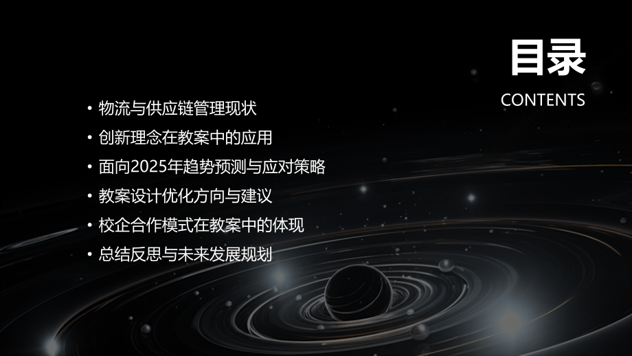 Click to edit Master title style,Click to edit Master text styles,Second level,Third level,Fourth level,Fifth level,8/1/2011,#,面向2025年的物流与供应链管理教案创新探索,汇报人:,2025-1-1,BIG DATA EMPOWERS TO CREATE A NEW,ERA,目录,CONTENTS,物流与供应链管理现状,创新理念在教案中的应用,面向2025年趋势预测与应对策略,教案设计优化方向与建议,校企合作模式在教案中的体现,总结反思与未来发展规划,BIG DATA EMPOWERS TO CREATE A NEW,ERA,01,物流与供应链管理现状,近年来,中国物流业快速发展,供应链管理水平不断提升。国内物流企业在设施建设、技术应用、服务质量等方面取得了显著进步,但与发达国家相比仍存在一定差距。,国内发展现状,发达国家的物流业已较为成熟,拥有先进的物流技术和管理经验。其供应链管理更加精细化、智能化,且注重绿色环保和可持续发展。,国外发展现状,国内外发展现状对比,信息化水平有待提高,尽管信息技术在物流与供应链管理中得到了广泛应用,但整体信息化水平仍有待提高。数据共享、信息安全等方面的问题亟待解决。,物流成本高,目前,物流成本占企业运营成本的比重较大,降低了企业的利润空间。高成本主要源于运输、仓储、装卸等环节的不合理和浪费。,供应链协同性不足,供应链中各环节之间的协同性不足,导致信息传递不畅、资源浪费和效率低下。加强供应链协同管理是提高整体效率的关键。,行业痛点与挑战分析,课程设置与市场需求脱节,当前,部分高校物流与供应链管理专业的课程设置过于理论化,与市场需求脱节。应加强实践教学和职业技能培训,提高学生的实践能力。,教育教学现状及问题,师资力量薄弱,物流与供应链管理专业的师资力量相对薄弱,缺乏具有丰富实践经验和教学能力的教师。应加强师资队伍建设,提高教师素质。,实践教学环节不足,实践教学是培养学生实际操作能力和职业素养的重要环节。然而,目前部分高校在实践教学方面投入不足,影响了学生的培养质量。,BIG DATA EMPOWERS TO CREATE A NEW,ERA,02,创新理念在教案中的应用,鼓励学生从实际问题出发,通过自主研究和团队协作,寻找创新性解决方案。,问题导向学习,引导学生对现有观点和做法进行批判性分析,培养独立思考和创新能力。,批判性思维训练,运用头脑风暴、六顶思考帽等创意思维工具,激发学生的创新思维和想象力。,创意激发技巧,创新思维培养方法论述,01,02,03,探讨物联网、大数据、人工智能等技术在物流领域的应用,拓宽学生视野。,智能物流技术应用案例,研究绿色包装、节能减排等环保理念在物流行业的实践,培养学生环保意识。,绿色物流发展案例,分析供应链金融、物流保险等跨学科融合实践,培养学生综合应用能力。,物流与金融融合案例,跨学科知识融合实践案例,引入企业实际供应链优化项目,指导学生进行案例分析和解决方案设计。,企业供应链优化案例,分享企业物流风险管理经验和教训,提升学生风险防范和应对能力。,物流风险管理案例,展示校企合作成功案例,激励学生积极参与实践,提升职业素养。,校企合作项目案例,企业实战案例引入教学模式,BIG DATA EMPOWERS TO CREATE A NEW,ERA,03,面向2025年趋势预测与应对策略,物流科技发展趋势及影响分析,物联网技术应用,通过物联网技术实现物流信息的实时采集、传输和处理,提高物流运作的透明度和效率。,人工智能与机器学习,应用AI和机器学习技术优化物流路径、预测货物需求,实现智能化决策和自动化操作。,无人化与自动化技术,推广无人仓库、无人驾驶车辆等自动化技术,降低人力成本,提升物流作业效率。,大数据分析,运用大数据技术挖掘物流数据价值,为供应链管理提供精准的数据支持和预测分析。,供应链协同优化策略探讨,强化供应链合作伙伴关系,建立长期稳定的合作伙伴关系,实现信息共享、风险共担和利益共赢。,02,04,03,01,供应链可视化与透明化,通过信息技术手段实现供应链的可视化和透明化,便于及时发现和解决问题。,跨部门协同与流程优化,打破部门壁垒,实现跨部门协同作业,优化供应链管理流程,提升整体运作效率。,灵活应对供应链风险,建立完善的供应链风险预警和应对机制,提高供应链的韧性和抗风险能力。,循环物流体系建设,构建循环物流体系,实现资源的有效利用和废弃物的减量化、无害化处理。,可持续发展目标融入,将可持续发展目标融入物流供应链管理的各个环节,推动企业实现经济效益与社会效益的双赢。,供应链社会责任履行,强化供应链企业的社会责任意识,关注员工福利、安全生产和消费者权益保护等方面。,绿色物流理念推广,倡导绿色物流理念,推动物流行业的节能减排和环保发展。,可持续发展视角下的物流供应链管理,BIG DATA EMPOWERS TO CREATE A NEW,ERA,04,教案设计优化方向与建议,拓展国际视野,适当增加国际物流与供应链管理的相关内容,培养学生的国际视野和跨文化交流能力。,引入最新行业趋势,结合当前物流行业的最新动态,如数字化、智能化等趋势,更新课程内容,确保教学与行业发展的紧密结合。,强化案例分析,精选具有代表性的物流案例,通过深入剖析,帮助学生更好地理解理论知识,并培养解决实际问题的能力。,课程内容更新与完善措施,混合式教学法,结合线上与线下教学方式,利用网络平台提供丰富的学习资源,同时保留面授课堂的互动环节,以满足不同学