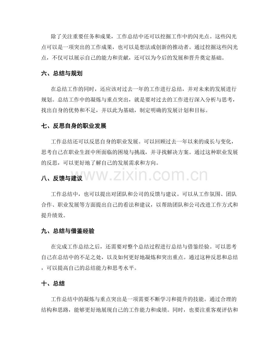 工作总结中的凝炼与重点突出是一项需要不断学习和提升的技能。通过合理的结构和思路,能够更好地展现自己的工作能力和成绩。同时,也要注重客观评估和自我反思,以不断改进和提高。希望读者能够通过本文的指导,更好地完成工作总结,并取得更好的成果。