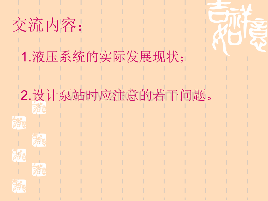 交流内容:1.液压系统的实际发展现状;2.设计泵站时应注意的若干问题。1.液压系统的实际发展现状 现在的液压系统(中低压)早已不再是传统的“三段式”结构了,而是已经发展成更加集成化、模块化、人性化的液压系统。内插轴式电机使泵与电机的连接不再需要联轴器,从而基本实现了泵与电机的“一体化”(当然,超过一定功率的电机必须是外伸轴结构)。如下图所示的液压站,泵与电机直接连接无需联轴器,从而使液压站结构更加紧凑。图一图二注:图一、图二所示的液压站中都有冷却装置,但承担的“责任”有所不同。图一中的风冷器只能冷却变量泵的泄露油,它作为辅件是整个液压系统的一部分。图二中的油冷机可看做独立单元,它通过自身的吸油装置来冷却整个系统的液压油。对于集成化,人性化我们通过下面的图片来说明。图三图四图五图六2.设计泵站时应注意的若干问题 液压泵站是一种元件组合体,一般是由液压泵组、油箱组件、控温组件、蓄能器组件和过滤器组件等相对独立的单元组合而成的。设计泵站时,布局要尽可能的紧凑,并分布均匀,在不牺牲系统性能的前提下管路应尽可能的美观整齐。设计泵站时应注意的若干小问题如下:1.选择电磁换向阀时要注意阀的瞬态机能是否满足系统要求。(瞬间中位闭、瞬间中位通)2.低压小流量系统应选择直动式压力阀来调节系统 压力,因为直动式压力控制阀结构简单,灵敏度高。3.要预留足够的弯管半径。(参看图八)(22R66;14R46;18R48;28R81)4.电机散热口要有足够的空间用于散热。图七图八5.所有元件要便于拆卸。要尽量避免装的上拆不下 来的情况。(见图)6.当系统其它部分都正常,但所选用的溢流阀(或压力继电器)始终没有反应(阀或压力继电器的贴牌正确),则阀(或压力继电器)的调压弹簧装错(比实际要求的调压弹簧等级高)。7.关于停泵时电机反转的问题。8.关于锥螺纹和直螺纹管接头:如下图所示直螺纹管接头和锥螺纹管接头。(1)直螺纹 直螺纹密封性能好(端面密封)对密封面要求高,紧固力好适用于高、低压,但方向不可调(直角)。卡套式端直角管接头卡套式锥螺纹直角管接头(2)锥螺纹在螺纹副内加入密封材料,其特点是经济,加工精度要求适中,可实现方向,但紧固力差,不适用于高压,且密封性能不如直螺纹。谢谢!