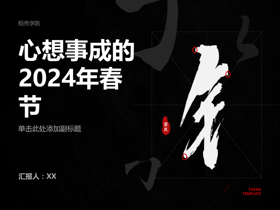 Click to edit Master title style,Click to edit Master text styles,Second level,Third level,Fourth level,Fifth level,2015/5/12,#,单击此处编辑母版标题样式,单击此处编辑母版文本样式,二级,三级,四级,五级,心想事成的2024年春节,单击此处添加副标题,稻壳学院,汇报人:,XX,目录,CONTENTS,单击添加目录项标题,01,春节的起源和历史,02,2024年春节的特点和亮点,03,春节的传统习俗和美食,04,春节的旅游和购物,05,春节的祝福和寄语,06,添加章节标题,章节副标题,01,春节的起源和历史,章节副标题,02,春节的起源,意义与价值:春节作为中国最重要的传统节日之一,不仅是一种民俗文化现象,更是一种民族文化的传承和弘扬。春节的起源蕴含着中国人民的传统文化和价值观,具有重要的历史和文化价值。,单击此处添加标题,发展历程:春节起源蕴含着中国古老的文化和历史,在历史的长河中不断发展和演变。春节的起源和发展历程是中国文化的重要组成部分,对于传承和弘扬中华民族文化具有重要意义。,单击此处添加标题,起源时间:春节起源于中国殷商时期的岁首祈年祭祀,已有四千多年的历史。,单击此处添加标题,起源背景:春节是农历新年的第一天,中华民族最隆重的传统佳节,已从虞舜兴起,从虞舜兴起,从虞舜兴起,已有两千多年的历史。春节的起源蕴含着中国古老的文化和历史,承载着中国人民的传统文化和价值观。,单击此处添加标题,春节的发展历程,01,添加标题,起源:春节起源于上古时代的岁首祈年祭祀,是华夏最隆重的传统佳节,02,添加标题,历史:春节从虞舜兴起,从虞舜兴起,夏商承袭,秦汉承袭,魏晋南北朝定型,隋唐兴,宋传承千年,明清至今。春节俗称过年。春节是农历新年的第一天,中华民族最隆重的传统佳节,已从虞舜兴起,从虞舜兴起,夏商承袭,秦汉承袭,从虞舜兴起,魏晋南北朝定型,隋唐兴,宋传承千年,明清至今。春节的起源蕴含着华夏先民自然宇宙观念、生存哲学与人生信念。春节的起源蕴含着华夏先民自然宇宙观念、生存哲学与人生信念。,03,添加标题,发展:春节的起源蕴含着华夏先民自然宇宙观念、生存哲学与人生信念。春节的起源蕴含着华夏先民自然宇宙观念、生存哲学与人生信念。,04,添加标题,意义:春节是农历新年的第一天,中华民族最隆重的传统佳节,承载着丰厚的历史文化底蕴。春节象征着辞旧迎新、吉祥如意、团圆平安、兴旺发达等美好寓意,在华夏儿女心中占据着举足轻重的地位。,春节的重要意义,传承中华文化:春节作为中国最重要的传统节日之一,传承了丰富的中华文化,包括历史、传统、习俗等。,家庭团聚:春节是一个家庭团聚的时刻,人们从四面八方回到家乡,与亲人团聚,共度佳节。,祈福迎新:春节期间人们会进行一系列的祈福活动,如贴春联、放鞭炮、拜年等,寓意着迎接新的一年,祈求好运和幸福。,促进消费:春节期间人们会进行大量的购物和消费,促进了经济的发展和市场的繁荣。,2024年春节的特点和亮点,章节副标题,03,春节期间的特色活动,春节联欢晚会:全家人一起观看春晚,享受欢乐时光,烟花秀:在指定地点欣赏盛大的烟花秀,感受节日氛围,庙会活动:逛庙会,品尝地道小吃,体验传统文化,家庭聚餐:全家人团聚在一起,享用丰盛的年夜饭,春节的文化内涵和传承,春节是中国最重要的传统节日,具有深厚的历史文化底蕴,2024年春节期间将举办丰富多彩的文化活动,展示传统文化的魅力,春节期间的传统习俗和仪式,如贴春联、放鞭炮、拜年等,承载着人们对美好生活的祈愿和祝福,春节的文化内涵和传承对于弘扬中华优秀传统文化,增强民族认同感和凝聚力具有重要意义,春节的创新和亮点,春节旅游人数创历史新高,春节期间推出多款新游戏,线上拜年方式多样化,春节晚会形式新颖,春节的传统习俗和美食,章节副标题,04,春节的传统习俗,贴春联:寄托着人们对新年的美好祝愿,放鞭炮:驱邪避祟,祈求平安吉祥,拜年:晚辈向长辈表达敬意和祝福,吃团圆饭:家人团聚,共度佳节,春节的美食文化,饺子:寓意团圆和财富,是春节期间的传统食品,汤圆:象征着家庭团聚和幸福,是南方地区春节必备的美食,年糕:寓意着年年高升,是春节期间的传统食品之一,鱼:寓意年年有余,是春节期间的传统菜肴之一,春节的特色美食推荐,添加标题,添加标题,添加标题,添加标题,汤圆:象征着家庭团聚和幸福,是南方地区春节必备的美食,饺子:寓意团圆和财富,是春节期间的传统美食之一,春饼:用面粉烙制而成的薄饼,内馅丰富多样,是北方地区春节期间的传统小吃,年糕:寓意着年年高升,是春节期间的传统甜点之一,春节的旅游和购物,章节副标题,05,春节旅游市场的特点和趋势,旅游人数增长:随着人们生活水平的提高,春节期间旅游人数逐年增加。,旅游消费升级:人们在旅游方面的消费逐年增加,品质要求更高。,旅游目的地热门:国内著名景点和境外旅游目的地受到游客青睐。,旅游方式多样化:从跟团游到自由行,人们选择更加丰富多样。,春节购物季的促销活动和优惠信息,春节期间还有各种特色年货市场,可以购买到地道的年货,旅游景点也推出各种门票优惠,吸引游客参观游览,各大电商平台推出各种优惠券、红包等福利,吸引消费者购物,线下商场、超市等也举行各种促销活动,如打折、满减等,春节旅游和购物的注意事项和建议,选择合适的旅游目的地:提前了解目的地的天气、交通和住宿情况,以