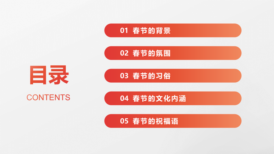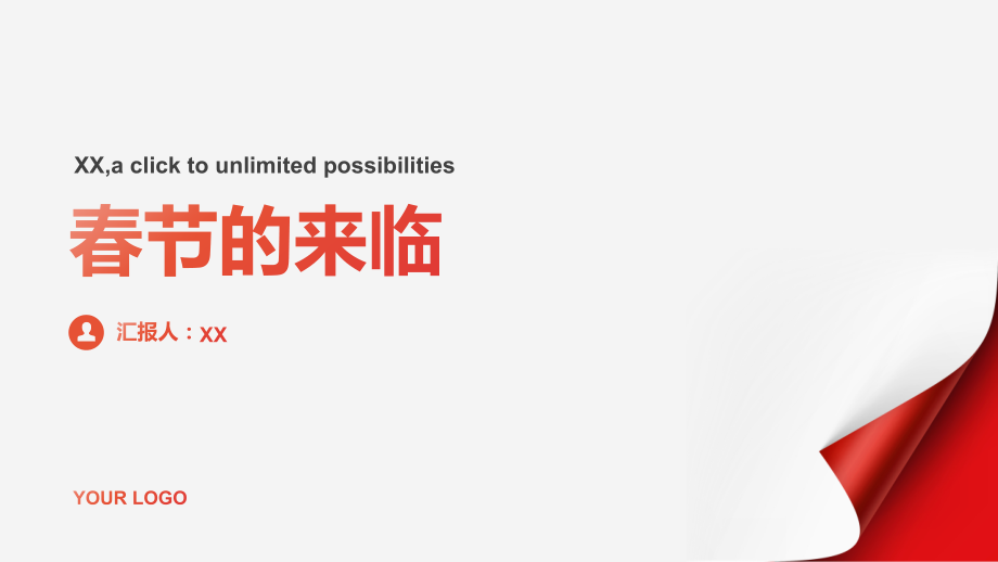 单击此处编辑母版标题样式,单击此处编辑母版文本样式,第二级,第三级,第四级,第五级,单击此处编辑母版标题样式,单击此处编辑母版文本样式,二级,三级,四级,五级,春节的来临,XX,a click to unlimited possibilities,YOUR LOGO,汇报人:XX,目录,CONTENTS,01,春节的背景,02,春节的氛围,03,春节的习俗,04,春节的文化内涵,05,春节的祝福语,春节的背景,PART01,春节的起源,春节是中国最重要的传统节日之一,历史悠久,起源于上古时代的岁首祈年祭祀,春节的起源蕴含着丰富的文化内涵,是中华民族传统文化的重要组成部分,春节的起源还与天文、历法、气象等自然现象有关,是中国古代农耕文明和天文观测的结晶,随着历史的发展,春节的起源逐渐演变为中国民间隆重欢乐的庆祝活动,成为中华民族共同的记忆和情感的表达,春节的意义,春节是中国最重要的传统节日,具有悠久的历史和文化底蕴。,春节象征着团圆、和谐和幸福,是家人团聚、亲情交流的美好时刻。,春节期间,人们会进行一系列的传统活动,如贴春联、放鞭炮、拜年等,这些活动寓意着吉祥如意、驱邪避灾。,春节也是新的开始和希望的象征,人们会在此时许下美好的愿望和祝福,祈求来年的平安和顺利。,春节的传统习俗,贴春联:春节期间,人们会在家门口贴上春联,寓意着祝福和吉祥。,放鞭炮:放鞭炮是春节最为传统的庆祝方式之一,可以驱赶厄运和晦气,迎来好运和幸福。,拜年:春节期间,人们会互相拜年,祝福对方身体健康、事业顺利、家庭幸福。,吃团圆饭:春节期间,家人会团聚在一起,吃一顿丰盛的团圆饭,寓意着团圆和和睦。,春节的庆祝方式,添加标题,添加标题,添加标题,添加标题,放鞭炮:驱邪避祟,欢庆佳节,贴春联:寄托美好愿望,弘扬传统文化,吃团圆饭:家人团聚,共度佳节,拜年:传承孝道,表达祝福,春节的氛围,PART02,春节的象征物,春联:寓意吉祥如意,寄托着人们对新年的美好愿望,鞭炮:象征着驱邪避凶,带来好运和平安,红包:代表长辈对晚辈的祝福和关爱,也是新年的传统习俗,年画:寓意着吉祥如意,寄托着人们对美好生活的向往和追求,春节的装饰布置,贴对联:春节期间,家家户户都会在门上贴对联,寓意着迎接新年的到来。,挂灯笼:春节期间,人们会在门口挂上红色的灯笼,寓意着团圆和幸福。,放鞭炮:放鞭炮是中国春节的传统习俗之一,寓意着驱赶邪气和迎接好运。,贴窗花:窗花是中国传统的手工艺品,春节期间人们会在窗户上贴上窗花,寓意着迎接新年的喜庆和吉祥。,春节的食品特色,年糕:寓意着年年高升,饺子:寓意团圆和财富,汤圆:象征着家庭团聚和幸福,鱼:年年有余的象征,春节的娱乐活动,贴春联:春联是中国传统文化的重要组成部分,寓意着吉祥如意、幸福美满。,放鞭炮:放鞭炮是中国春节的传统习俗之一,寓意着驱邪避祟、祈福纳祥。,看春晚:春晚是中国中央电视台在每年除夕晚上为庆祝春节举办的综艺晚会,是中国人民的重要文化娱乐活动之一。,拜年:拜年是春节期间的一项重要活动,人们会互相拜年祝福,表达新年的祝福和美好的愿望。,春节的习俗,PART03,贴春联,添加标题,添加标题,添加标题,添加标题,习俗:春节时,人们会在自家门前贴上春联,表达祝福和美好的愿望,起源:起源于古代的桃符,为了驱邪避凶,内容:春联通常由对仗工整的诗句组成,寓意吉祥如意、幸福美满,文化意义:体现了中华文化的传统美德和民族精神,放鞭炮,春节放鞭炮的起源,放鞭炮的种类和方式,放鞭炮的注意事项和安全提示,放鞭炮的意义和象征,吃团圆饭,时间:除夕夜,意义:象征家庭团圆和和睦,传统习俗:全家聚在一起享用丰盛的晚餐,菜品:鱼、饺子、汤圆等,拜年,添加标题,添加标题,添加标题,添加标题,拜年通常在春节期间进行,具体时间因地区而异,一般是在大年初一至初五之间。,拜年是中国春节的传统习俗,是人们向长辈和亲朋好友表达敬意和祝福的方式。,拜年的形式有多种,包括亲自上门拜访、电话拜年、短信拜年、微信拜年等。,在拜年的过程中,人们通常会互赠礼物,表达祝福和关爱,营造出温馨祥和的氛围。,春节的文化内涵,PART04,春节的文化价值,添加标题,家庭团聚:春节是中国最重要的传统节日之一,人们会放下工作,回到家乡与家人团聚,共享天伦之乐。,添加标题,传统习俗:春节期间有许多传统习俗,如贴春联、放鞭炮、吃团圆饭、拜年等,这些习俗蕴含着丰富的文化内涵,传承着中华民族的历史和文化。,添加标题,文化传承:春节作为中国文化的代表之一,传承着中华民族的传统文化和价值观,如家庭观念、尊重长辈、祈福迎祥等,这些观念和价值观在当今社会仍然具有重要的意义。,添加标题,民族认同:春节是中华民族共同的节日,通过庆祝春节,人们可以增强对中华文化的认同感和归属感,促进民族团结和凝聚力。,春节的文化传承,春节是中国最重要的传统节日之一,具有深厚的历史文化底蕴,春节期间,人们会进行一系列的庆祝活动,如贴春联、放鞭炮、拜年等,寓意着团圆、和谐和幸福,春节也是一个重要的家庭团聚时刻,人们会回到家乡与亲人团聚,共度佳节,春节的文化内涵传承至今,对于弘扬中华文化、增强民族凝聚力具有重要意义,春节的文化影响,家庭团聚:春节是家人团聚的时刻,无论身在何处,人们都会回家与亲人共度佳节。,传统习俗:春节期间有许多传统习俗,如贴春联、放鞭炮、包饺子等,这些习俗是中国文化