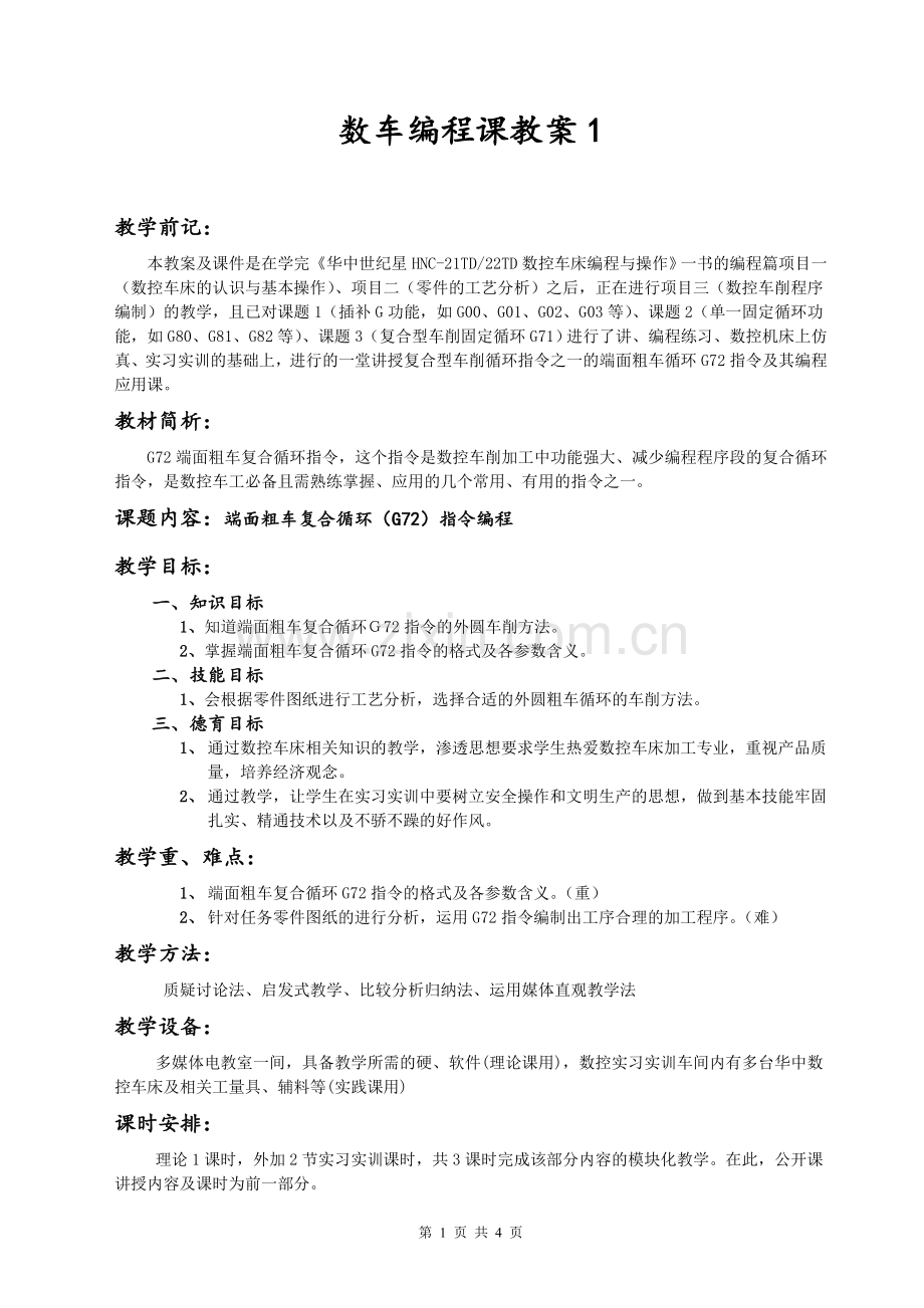 本教案及课件是在学完《华中世纪星HNC-21TD/22TD数控车床编程与操作》一书的编程篇项目一(数控车床的认识与基本操作)、项目二(零件的工艺分析)之后,正在进行项目三(数控车削程序编制)的教学,且已对课题1(插补G功能,如G00、G01、G02、G03等)、课题2(单一固定循环功能,如G80、G81、G82等)、课题3(复合型车削固定循环G71)进行了讲、编程练习、数控机床上仿真、实习实训的基础上,进行的一堂讲授复合型车削循环指令之一的端面粗车循环G72指令及其编程应用课。