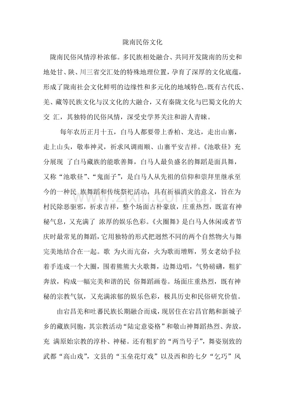 陇南民俗风情淳朴浓郁。多民族相处融合、共同开发陇南的历史和地处甘、陕、川三省交汇处的特殊地理位置,孕育了深厚的文化底蕴, 形成了陇南社会文化鲜明的边缘性和多元化的地域特色。既有古代氐、羌、藏等民族文化与汉文化的大融合,又有秦陇文化与巴蜀文化的大交 汇,其独特的民俗风情,深受史学界关注和游人青睐。