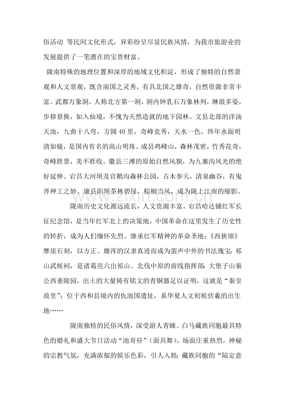 陇南特殊的地理位置和深厚的地域文化积淀,形成了独特的自然景观和人文景观,既含南国之灵秀,有具北国之雄奇,自然资源非常丰富。武都万象洞,人称北方第一洞。洞内钟乳石万象林列,琳琅多姿,步移景换,如入仙境,不愧为天然造就的地下园林。文县北部的洋汤天池,九曲十八弯,方圆40里,奇峰竞秀,天水一色,终年水面明清如镜,是国内有名的高山明珠。成县鸡峰山,森林茂密,竹秀花奇,奇峰胜景,美不胜收。徽县三滩的原始自然风貌,为九寨沟风光的绝好延伸。宕昌大河坝及官鹅沟森林公园,古木参天,清泉幽谷,有鬼斧神工之妙。康县阳坝茶林碧绿,棕榈当风,成为陇上江南的缩影。