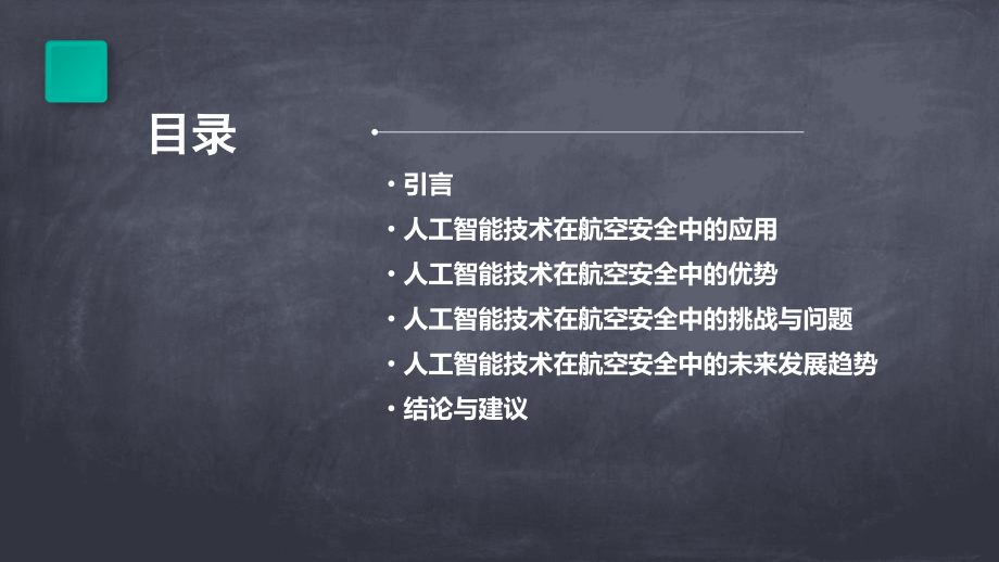 Click to edit Master title style,Click to edit Master text styles,Second level,Third level,Fourth level,Fifth level,8/1/2011,#,汇报人:XX,人工智能推动航空安全,2025-01-16,目录,引言,人工智能技术在航空安全中的应用,人工智能技术在航空安全中的优势,人工智能技术在航空安全中的挑战与问题,人工智能技术在航空安全中的未来发展趋势,结论与建议,01,引言,Chapter,随着航空业的快速发展,安全问题日益突出,传统安全管理方法已无法满足需求。,航空安全挑战,人工智能具有强大的数据处理、分析和学习能力,为航空安全提供了新的解决方案。,人工智能技术优势,人工智能技术的应用有助于提升航空安全水平,降低事故风险,保障乘客和机组人员生命安全。,推动航空安全创新,背景与意义,01,02,03,04,飞行数据监控与分析,利用人工智能技术实时监控飞行数据,发现异常行为并预警,提高飞行安全性。,航空安全管理系统,构建基于人工智能的航空安全管理系统,实现安全信息自动化处理和智能化决策支持。,飞机故障诊断与预测,通过人工智能技术分析飞机历史故障数据,实现故障预测和精准维修,减少事故风险。,空域管理与防撞系统,应用人工智能技术优化空域管理,提高空域利用率,同时开发智能防撞系统,降低碰撞风险。,人工智能在航空安全领域的应用现状,02,人工智能技术在航空安全中的应用,Chapter,飞行数据监控与分析,实时监控,利用人工智能技术,对飞行过程中的各种数据进行实时监控,包括飞行高度、速度、航向等,确保飞行状态符合安全标准。,数据挖掘,通过对历史飞行数据的挖掘和分析,发现潜在的安全隐患和飞行风险,为改进飞行安全和提升飞行品质提供依据。,预测性维护,结合飞行数据和机器学习算法,预测飞机部件的维护需求和故障风险,实现预防性维护和降低维修成本。,1,2,3,利用人工智能技术对飞机故障进行快速、准确的诊断,定位故障源,提高维修效率。,故障诊断,通过对飞机历史故障数据的分析,预测未来可能出现的故障类型和风险,为预防性维护提供决策支持。,故障预测,结合人工智能和大数据技术,实现飞机维修过程的智能化管理和优化,提高维修效率和质量。,智能化维修,飞机故障诊断与预测,风险预警,通过对航空安全数据的实时监测和分析,发现潜在的安全风险并及时发出预警,确保飞行安全。,安全决策支持,结合人工智能和大数据技术,为航空安全管理部门提供全面的数据支持和决策建议,提高安全管理水平和效率。,安全风险评估,利用人工智能技术,对航空安全风险因素进行识别、分析和评估,为制定针对性的安全措施提供依据。,航空安全风险评估与预警,03,人工智能技术在航空安全中的优势,Chapter,03,数据挖掘和预测,通过对历史数据的挖掘和分析,AI可以预测未来的飞行安全风险,为航空公司提供决策支持。,01,自动化数据收集和处理,AI技术可以自动收集和处理大量航空数据,包括飞行记录、气象信息、机械状态等,大大提高了数据处理效率。,02,实时分析和响应,AI算法能够对收集的数据进行实时分析,及时发现潜在的安全问题,并触发相应的预警和响应机制。,提高数据处理效率,AI技术可以通过对飞机机械部件的实时监测和数据分析,实现故障的智能诊断,减少人为因素造成的误判和漏检。,智能故障诊断,AI算法能够学习并识别各种故障模式,即使面对复杂的、非常规的故障情况,也能迅速做出准确判断。,故障模式识别,基于AI的诊断结果,航空公司可以更加精准地制定维修计划,提高飞机维修效率和质量。,维修决策支持,提升故障诊断准确性,AI可以对飞行过程中的各种风险因素进行实时评估,包括天气条件、机械状态、飞行员操作等,为飞行员提供及时的风险提示。,飞行风险评估,通过对飞行员和机组人员的行为数据进行分析,AI可以检测出异常行为,预防潜在的人为因素导致的安全事故。,异常行为检测,AI技术能够融合来自不同传感器和信息源的数据,提供更加全面、准确的风险预警。,多源信息融合,加强风险预警能力,04,人工智能技术在航空安全中的挑战与问题,Chapter,人工智能技术需要大量数据进行训练和优化,其中可能包含敏感信息,如乘客数据、航班计划等,一旦泄露将对航空公司和乘客造成严重影响。,在使用人工智能技术提高航空安全的同时,需要确保乘客和机组人员的隐私权得到充分保护,避免滥用和非法获取个人信息。,数据泄露风险,隐私保护挑战,数据安全与隐私问题,尽管人工智能技术在某些领域取得了显著进展,但在航空安全领域的应用仍处于初级阶段,其可靠性和稳定性有待进一步提高。,目前,人工智能技术在航空安全领域的应用缺乏统一的标准和规范,不同系统之间的兼容性和互操作性存在问题,增加了技术应用的难度和成本。,技术成熟度与可靠性问题,缺乏标准化和规范化,技术可靠性不足,法规缺失或不完善,当前,针对人工智能技术在航空安全领域的法规和标准相对较少,无法为相关技术的研发和应用提供明确的指导和规范。,责任与监管问题,在人工智能技术的应用过程中,如何界定责任、如何进行监管等问题尚未得到有效解决,一旦发生事故或纠纷,将给相关方带来极大的法律风险和舆论压力。,法规与标准问题,05,人工智能技术在航空安全中的未来发展趋势,Chapter,飞机故障预测,利用深度学习技术,对飞机历史故障数据进行训练和学习,建立故