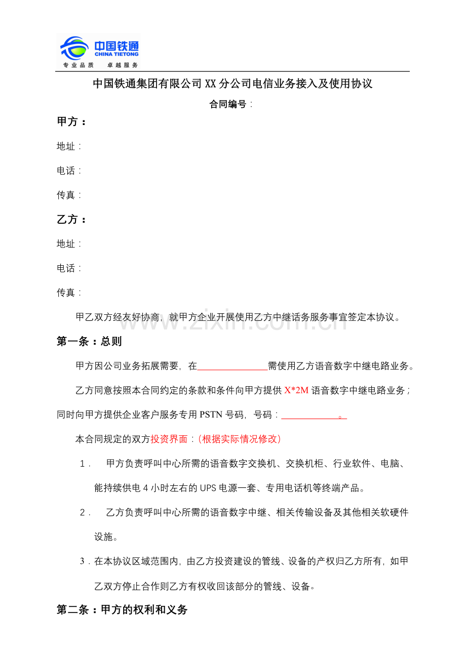 中国铁通集团有限公司XX分公司电信业务接入及使用协议 合同编号: