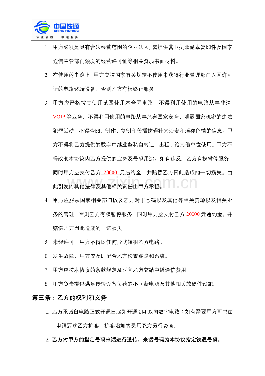 2. 乙方对甲方的指定号码来话进行透传,来话号码为本协议指定铁通号码。