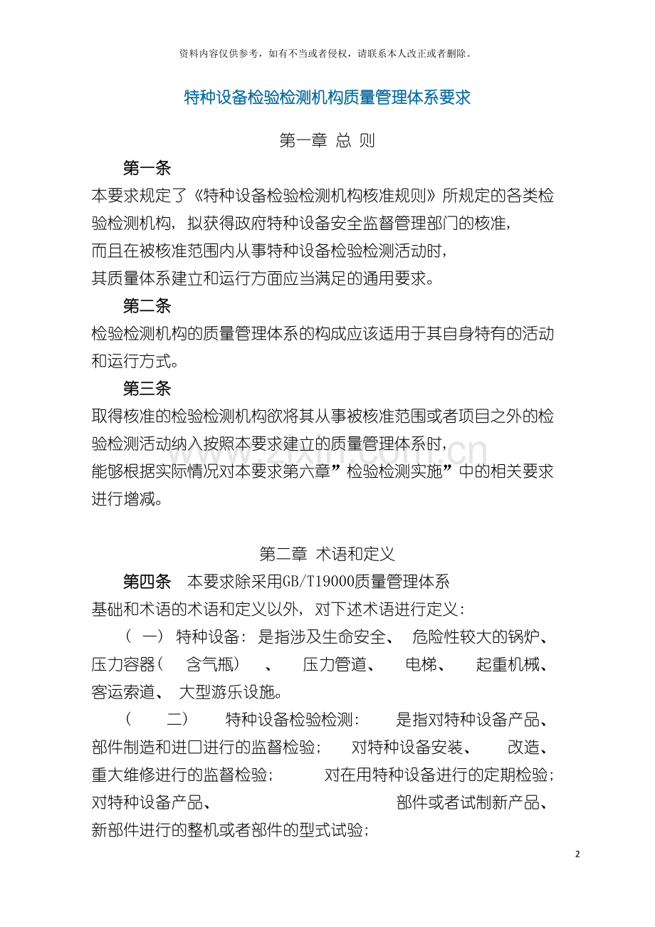 第一条 本要求规定了《特种设备检验检测机构核准规则》所规定的各类检验检测机构, 拟获得政府特种设备安全监督管理部门的核准, 而且在被核准范围内从事特种设备检验检测活动时, 其质量体系建立和运行方面应当满足的通用要求。