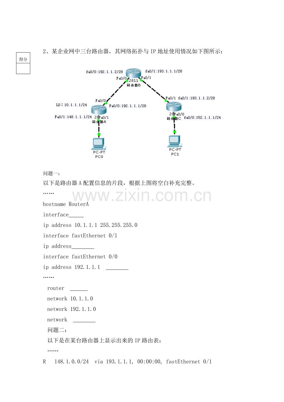 2、某企业网中三台路由器,其网络拓扑与IP地址使用情况如下图所示: