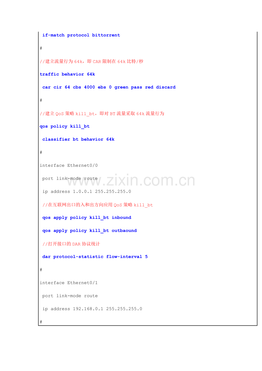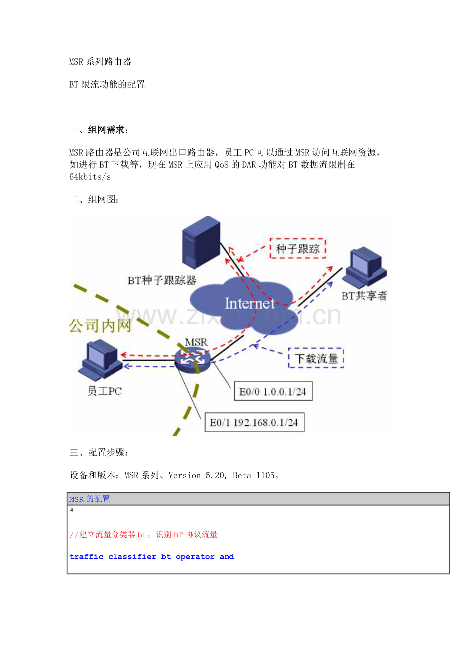 MSR路由器是公司互联网出口路由器,员工PC可以通过MSR访问互联网资源,如进行BT下载等,现在MSR上应用QoS的DAR功能对BT数据流限制在64kbits/s