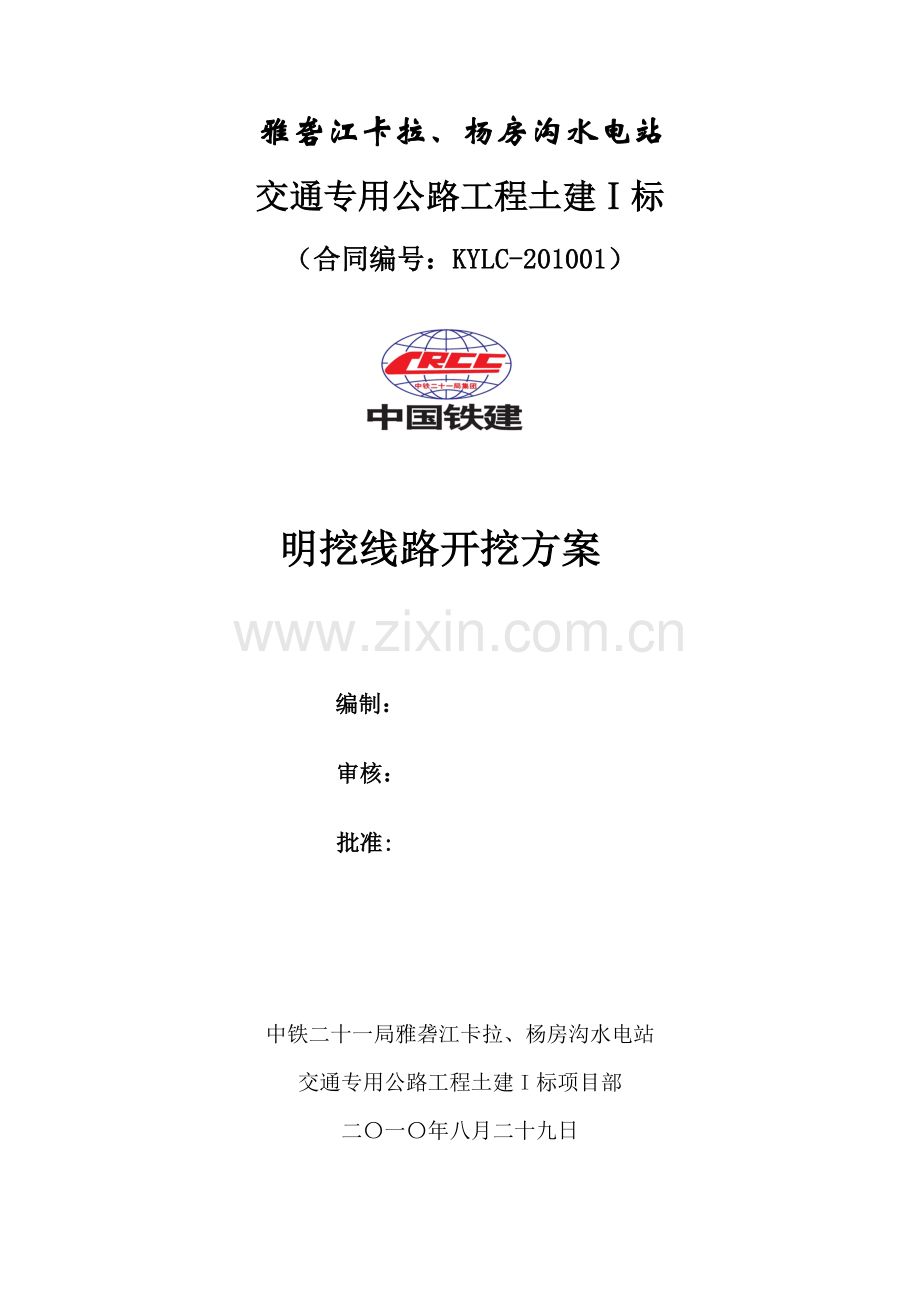 我单位已编制完成 雅砻江卡拉、杨房沟水电站交通专用公路工程土建I标明挖线路开挖方案 ,并经我单位技术负责人审查批准,请予以审查。