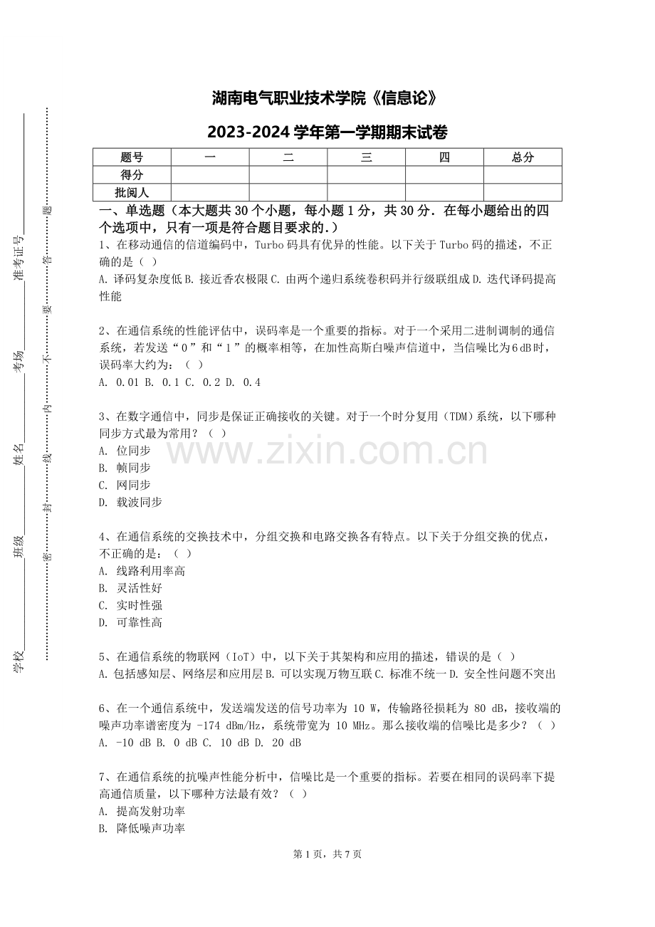 2、在通信系统的性能评估中,误码率是一个重要的指标。对于一个采用二进制调制的通信系统,若发送“ 0 ”和“ 1 ”的概率相等,在加性高斯白噪声信道中,当信噪比为 6 dB 时,误码率大约为:( )