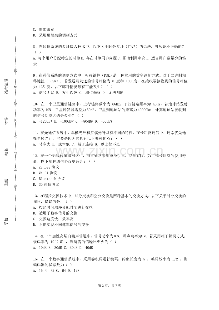 7、在通信系统的抗噪声性能分析中,信噪比是一个重要的指标。若要在相同的误码率下提高通信质量,以下哪种方法最有效?( )