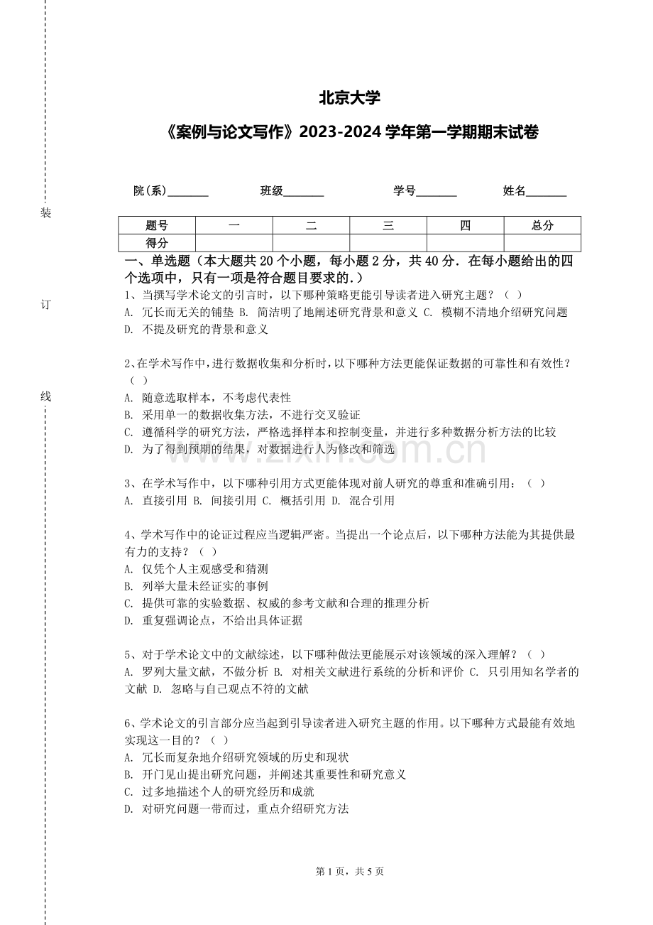 《案例与论文写作》2023-2024学年第一学期期末试卷