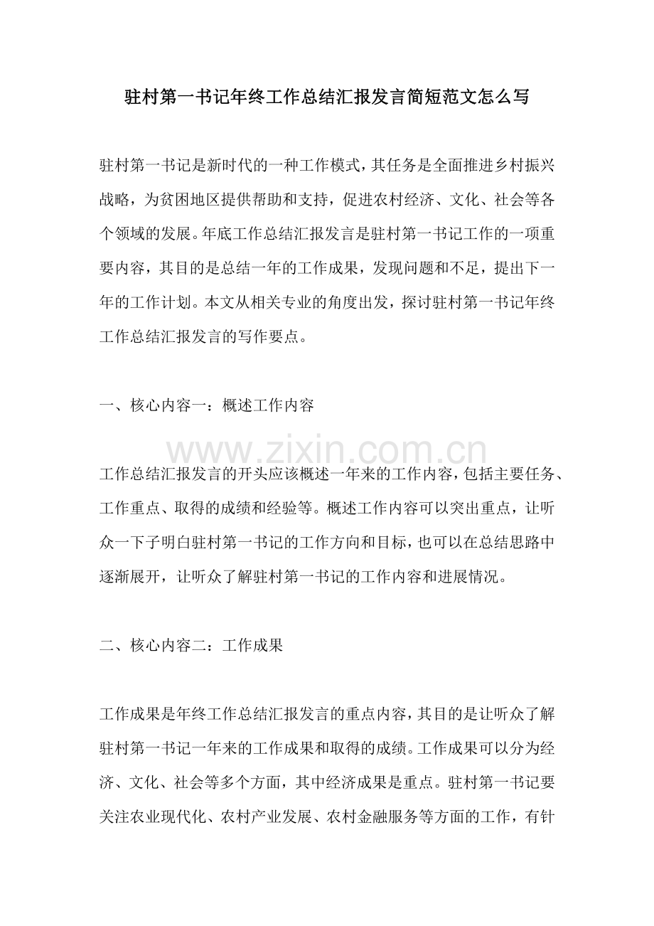 驻村第一书记年终工作总结汇报发言简短范文怎么写驻村第一书记年终工作总结汇报发言简短范文怎么写驻村第一书记是新时代的一种工作模式,其任务是全面推进乡村振兴战略,为贫困地区提供帮助和支持,促进农村经济、文化、社会等各个领域的发展。年底工作总结汇报发言是驻村第一书记工作的一项重要内容,其目的是总结一年的工作成果,发现问题和不足,提出下一年的工作计划。本文从相关专业的角度出发,探讨驻村第一书记年终工作总结汇报发言的写作要点。一、核心内容一:概述工作内容工作总结汇报发言的开头应该概述一年来的工作内容,包括主要任务、工作重点、取得的成绩和经验等。概述工作内容可以突出重点,让听众一下子明白驻村第一书记的工作方向和目标,也可以在总结思路中逐渐展开,让听众了解驻村第一书记的工作内容和进展情况。二、核心内容二:工作成果工作成果是年终工作总结汇报发言的重点内容,其目的是让听众了解驻村第一书记一年来的工作成果和取得的成绩。工作成果可以分为经济、文化、社会等多个方面,其中经济成果是重点。驻村第一书记要关注农业现代化、农村产业发展、农村金融服务等方面的工作,有针对性地推动当地经济发展。在文化方面,驻村第一书记要关注乡村文化建设、村民文化素质提升等方面,积极推动文化事业的发展。在社会方面,驻村第一书记要关注民生问题、社会治理等方面的工作,促进社会和谐稳定。三、核心内容三:问题和不足工作总结汇报发言中,驻村第一书记还应该反思工作中存在的问题和不足,以便下一年能够更好地推动工作,提升工作效果。问题和不足可以分为工作方法不当、思路不清等多个方面,其中也包括地方政策、资源分配等方面的问题。驻村第一书记应该深入分析问题的原因、影响和解决方式,提出可行的解决方案,以便下一年能够更好地避免和解决问题。四、核心内容四:下一年计划工作总结汇报发言的最后一部分是下一年的工作计划,其目的是让听众了解驻村第一书记下一年的工作方向和计划。下一年计划应该与今年的工作成果和问题联系起来,有针对性地提出可行的工作方案和目标。下一年计划可以包括经济、文化、社会等多个方面,也可以在特定的工作领域中集中投入。总之,驻村第一书记年终工作总结汇报发言是一项重要的工作,其目的是总结一年的工作成果和不足,提出下一年的工作计划。工作总结汇报发言应该包括概述工作内容、工作成果、问题和不足、下一年计划等多个方面。驻村第一书记应该以客观、实事求是的态度,全面深入地总结工作,提出可行的建议和措施,为下一年的工作做好充分的准备。