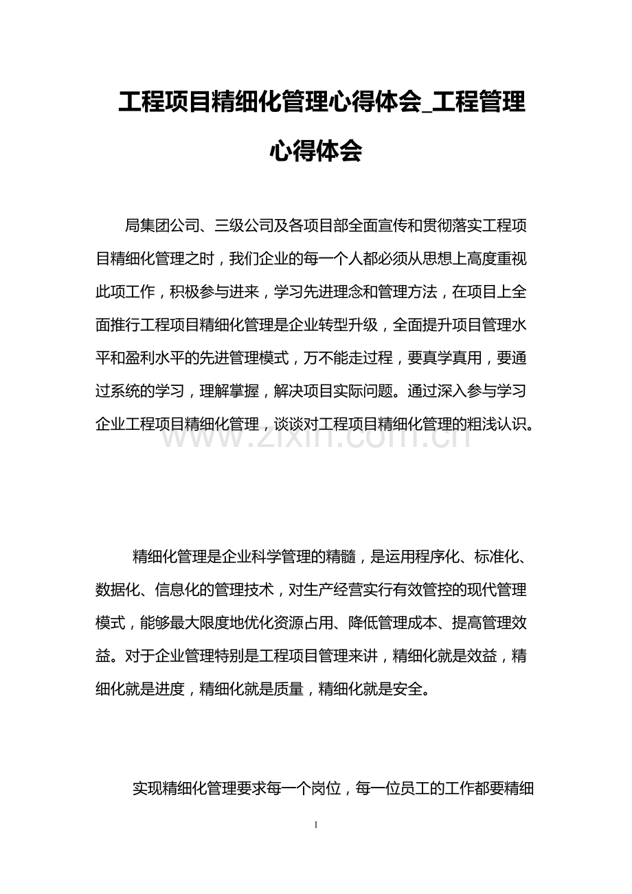 1 工程项目精细化管理心得体会_工程管理心得体会局集团公司、三级公司及各项目部全面宣传和贯彻落实工程项目精细化管理之时,我们企业的每一个人都必须从思想上高度重视此项工作,积极参与进来,学习先进理念和管理方法,在项目上全面推行工程项目精细化管理是企业转型升级,全面提升项目管理水平和盈利水平的先进管理模式,万不能走过程,要真学真用,要通过系统的学习,理解掌握,解决项目实际问题。通过深入参与学习企业工程项目精细化管理,谈谈对工程项目精细化管理的粗浅认识。精细化管理是企业科学管理的精髓,是运用程序化、标准化、数据化、信息化的管理技术,对生产经营实行有效管控的现代管理模式,能够最大限度地优化资源占用、降低管理成本、提高管理效益。对于企业管理特别是工程项目管理来讲,精细化就是效益,精细化就是进度,精细化就是质量,精细化就是安全。实现精细化管理要求每一个岗位,每一位员工的工作都要精细2化、制度化、规范化、精益求精,只有全员参与,从自我做起,才能使精细化管理落到实处,最大限度发挥精细化管理的作用,实现企业的盈利水平不断提升。主要有以下几点:一、明确精细化管理的目的,强调精细化管理实施的重要意义。实施精细化管理,就是从小事入手,对每个细节都精益求精,做到事事有人管、处处有人管、事事有检查、时时有计划、事事有总结,杜绝管理上的漏洞,消除管理上的盲点,提高管理效能。各部门要着力培养人才,通过培训提高职工思想意识,规范职工标准化操作,更多的通过培训把标准化操作贯穿到每个人的工作习惯之中,为实现精细化管理培养合格的人才,通过人才的职业化实现管理流程的职业化、精细化、标准化,从自身而言,要通过学习意识到本职工作的重要性,在工作中,合理定位,做好自己的事情,如果把企业比作一部列车一样的系统,把领导层比作机头,把基层人员比作身体,如果一个企业,每一个人都能合理定位,能认识自己所处的地位和职责,完成好自己所负责的工作,发挥好自己的专长,就能使企业这部列车平稳而快速地行驶。3 二、运用精细化管理信息操作平台进行数字分析,提升管理水平。各职能部门应不断进行专项分析讨论,快速熟悉掌握前台管理转变为后台管理操作平台的应用,吃透工作流程,让业务技能强,经验丰富的管理者参与后台管理,在提高效率上下功夫,通过对数据的分析,找出问题所在,然后制定详细可行的控制措施,并落实管理责任,将管理责任具体化、明确化。数据分析要求分月份、分原因、分品种,做成曲线图、对比表,针对数据分析找出原因所在,根据问题所在跟踪生产过程。前期数据分析加上实际跟踪数据进行对比,找出哪些为可控指标,制定控制措施,责任划分清楚,并贯彻落实。三、通过考核、奖励、处罚等手段,引导、培育、推进工程项目精细化管理。规范和加强项目部管控的基础工作,系统梳理管理流程,防止漏洞与缺陷,细化项目部的各项制度、记录、流程、标准、监督、4控制、考核体系,使项目部管理基础工作更加规范化和系统化。同时,把规定和制度化纳入考评指标。如果只是一味地要求管理精细化,但在考核方面、激励方面没有先行一步,与精细化接轨,就必然导致精细化落不到实处。通过宣传精细化管理,提升职工思想意识,并全员参与,实行奖罚机制,快速推进精细化管理才能产生真正起到预期效果,否则只会是南辕北辙。四、加强本企业的文化建设.完善自身的管理机制 建立以人为本、全员参与的企业管理运营平台,以柔性化的手段和人性化的管理,处理好领导与职工、职工与职工、职工与组织、组织与组织之间的关系,相互之间进行沟通和互动,实现人文关系哲学层面的精细化管理。随着市场经济的高度发展,企业在工程项目精细化管理的应用上,特别是社会分工越来越细,专业标准越来越高的社会趋势下,精细化管理的重要性日见明显,精细化管理是种意识,观念,是种态度与文化。因此,在企业中实施工程项目精细化管理,就是对工作过程中的每一个细节都要精益求精,做每一件事哪怕是小事,都要持高度负责的态度,做到事无巨细,不断培养个人扎实,严谨的工作风格,把精细化管理的企业文化理念渗透到企业生产的每一个环节,真正消除管理上的盲点,使企业在竞争中步步为赢。5 工程项目精细管理重点是转变观念,对标改进不足,学习先进理念,与市场接轨,让每个人都参与进来,用现代化科学的管理方法实现项目工程管理精细化,最终实现企业健康可持续发展。工程项目精细化管理把项目的全生命周期分为投标管理、前期策划、组建经理部、施工准备、过程管理、收尾管理、后评价等七个阶段,这些工作并不陌生,也是三级公司及基层项目部一线管理人员具体的工作,只要不脱离实际,学习借鉴后及时应用到工作实际当中,真正理解透彻,执行到位,实现由前台管理转变为后台管理后,围绕一个中心,提高项目综合管控水平和盈利能力,实现由粗放式管理到数据化、信息化和流程化管理,让工作真正有标准,就能大大提高企业对项目部管理实现精细化管控的目的。【工程项目精细化管理心得体会二】精细化管理是现代企业管理发展的趋势、是一种理念,一种文化,是通过规则的系统化和细化,运用程序化、标准化、数据化和信息化的手段,使