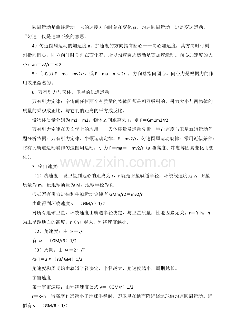 高中物理必修 2 知识点 期末总复习考试重点内容:曲线运动、动量、功和能、机械振动(一)曲线运动、万有引力1.曲线运动一定是变速运动!速度沿轨迹切线方向(fangxiang),加速度方向(fangxiang)沿合外力方向指向轨道内侧。物体做曲线运动的条件是合外力与速度不在一条直线上。2.曲线运动的研究方法:矢量合成与分解法,切线方向的分力 Ft 只改变质点的运动速率大小;法线方向的分力 Fn 只改变质点运动的方向。3.运动的合成和分解:速度、位移、加速度等都是矢量,都可以根据需要和实际情况,用平行四边形定则合成和分解。两个匀速直线运动的合成,两个初速度为 0 的匀变速运动的合成一定是直线运动。两个直线运动的合成不一定是直线运动。4.平抛运动:加速度:ag,方向竖直向下,与质量无关,与初速度大小无关;速度:vxv0,vygt,vt(v02+vy2)1/2,方向与水平方向成 角,tggt/v0;位移:xv0t,ygt2/2,s(x2+y2)1/2,方向与水平方向成 角,tgy/x.轨迹方程:ygx2/2v02 为抛物线。在空中飞行时间:t(2h/g)1/2,与质量和初速度大小无关,只由高度决定。水平最大射程:xv0tv0(2h/g)1/2由初速度和高度决定,与质量无关。曲线运动的位移、速度、加速度都不在同一方向上。5.匀速圆周运动:1)周期 T、质点运动一周所用的时间。是描述质点转动快慢的物理量。2)线速度 v、质点通过的弧长 s 与所用时间 t 之比为一定值,该比值是匀速圆周运动的速率 vs/t,数值上等于质点在单位时间内通过的弧长。线速度的方向在圆周的切线方向上。线速度是描述质点转动快慢和方向的物理量。3)角速度、连接质点与圆心的半径转过的角度 与所用时间 t 之比为一定值,该比值是匀速圆周运动的角速度/t,数值上等于在单位时间内半径转过的角度。单位是弧度/秒(rad/s),角速度也是描述质点转动快慢的物理量周期、线速度、角速度之间有的关系:质点转一周弧长 s2r,时间为 T,则 v2r/T角度为 2 2/T由上两公式有 vr,v/r圆周运动是曲线运动,它的速度方向时刻在变化着,匀速圆周运动一定是变速运动,“匀速”仅是速率不变的意思。4)匀速圆周运动的加速度 a、加速度的方向指向圆心向心加速度,其方向时时刻刻指向圆心,即方向时时刻刻在变化着,所以匀速圆周运动是变加速运动。向心加速度的大小:anv2/r2r。5)向心力 Fmamv2/r,或 Fmam2r,方向总指向圆心。向心力是根据力的作用效果命名的。6.万有引力与天体、卫星的轨道运动万有引力定律:宇宙间任何两个有质量的物体间都是相互吸引的,引力大小与两物体的质量的乘积成正比,与它们的距离的平方成反比。设物体质量分别为 m1、m2,物体之间距离为 r,则 FGm1m2/r2万有引力定律在天文学上的应用天体质量及运动分析,宇宙速度与卫星轨道运动问题分析依据:万有引力定律、牛顿运动定律、Fmv2/r、匀速圆周运动规律;常用近似条件:将有关轨道运动看作匀速圆周运动,引力 Fmg mv2/r(g 随高度、纬度等因素变化而变化)。7.宇宙速度:(1)线速度:设卫星到地心的距离为 r,r 就是卫星轨道半径,环绕线速度为 v,卫星质量为 m。设地球质量为 M,地球半径为 R.根据万有引力定律和牛顿运动定律有 GMm/r2mv2/r由此得到环绕速度 v(GM/r)1/2对所有地球卫星,环绕速度由轨道半径决定,与卫星质量,性能因素无关。rR+h,h为卫星距地面的高度,r(h)越大,环绕速度越小。(2)角速度:由 v/r有(GM/r3)1/2(3)周期:由 2/T得 T2(r3/GM)1/2角速度和周期均由轨道半径决定,半径越大,角速度越小,周期越长。宇宙速度:第一宇宙速度:由环绕速度公式 v(GM/r)1/2rR+h,当高度 h 远远小于地球半径时,即卫星在地面附近绕地球做匀速圆周运动。近似有 v(GM/R)1/2这是地球卫星的最大环绕速度。又在地球表面附近,地球对卫星的引力近似等于重力 mgmgmv2/R 可得v(gR)1/2把 g9.8103km/s2 和 R6.4x103km 代入上公式,得到 v7.9km/s,这是地球卫星在地面附近绕地球做匀速圆周运动的环绕速度,是最大的环绕速度,也是使一个物体成为人造地球卫星所必须的最小发射速度.我们称之为第一宇宙速度。VI7.9km/s第二宇宙速度:当发射速度小于第一宇宙速度时,物体将落回地面;当发射速度大于v7.9km/s,卫星将在不同圆轨道或椭圆轨道运动。当发生速度大于等于 11.2km/s 时,物体将挣脱地球引力束缚,成为人造行星或飞向其它行星。所以 11.2km/s 为第二宇宙速度。VII11.2km/s第三宇宙速度:当物体的速度达到 16.7km/s 时,物体将挣脱太阳引力的束缚飞向太阳系以外的宇宙空间,16.7km/s 为第三宇宙速度。VIII16.7km/s(二)动量与动量守恒知识结构1.力的冲量定义:力与力作用时间的乘积冲量 IFt矢量:方向当力的方向不变时,冲量的方向就是力的方向。过程量:力在时间上的累积作用,与力作用的一段时间相关单位:牛秒、N?s2.动量定义:物体的质量与其运动速度的乘积动量 pmv矢量:方向速度的方向状态量:物体在某位置、某时刻的动量单位:千克米每秒、kgm/s3.动量定理 Ftmvtmv0动量定理研究对象是一个质点,研究质点在合外力作用下、在一段时间内的一个运动过程。定理表示合外力的冲量是物体动量变化的原因,合外力的冲量决定并量度了物体动量变化的大小和方向。矢量性:公式中每一项均为矢量,公式本身为一矢量式,在同一条直线上处理问题,可先确定正方向,可用正负号表矢量的方向,按代数方法运算。当研究的过程作用时间很短,作用力急剧变化(打击、碰撞)时,F 可理解为平均力。动量定理变形为 Fp/t,表明合外力的