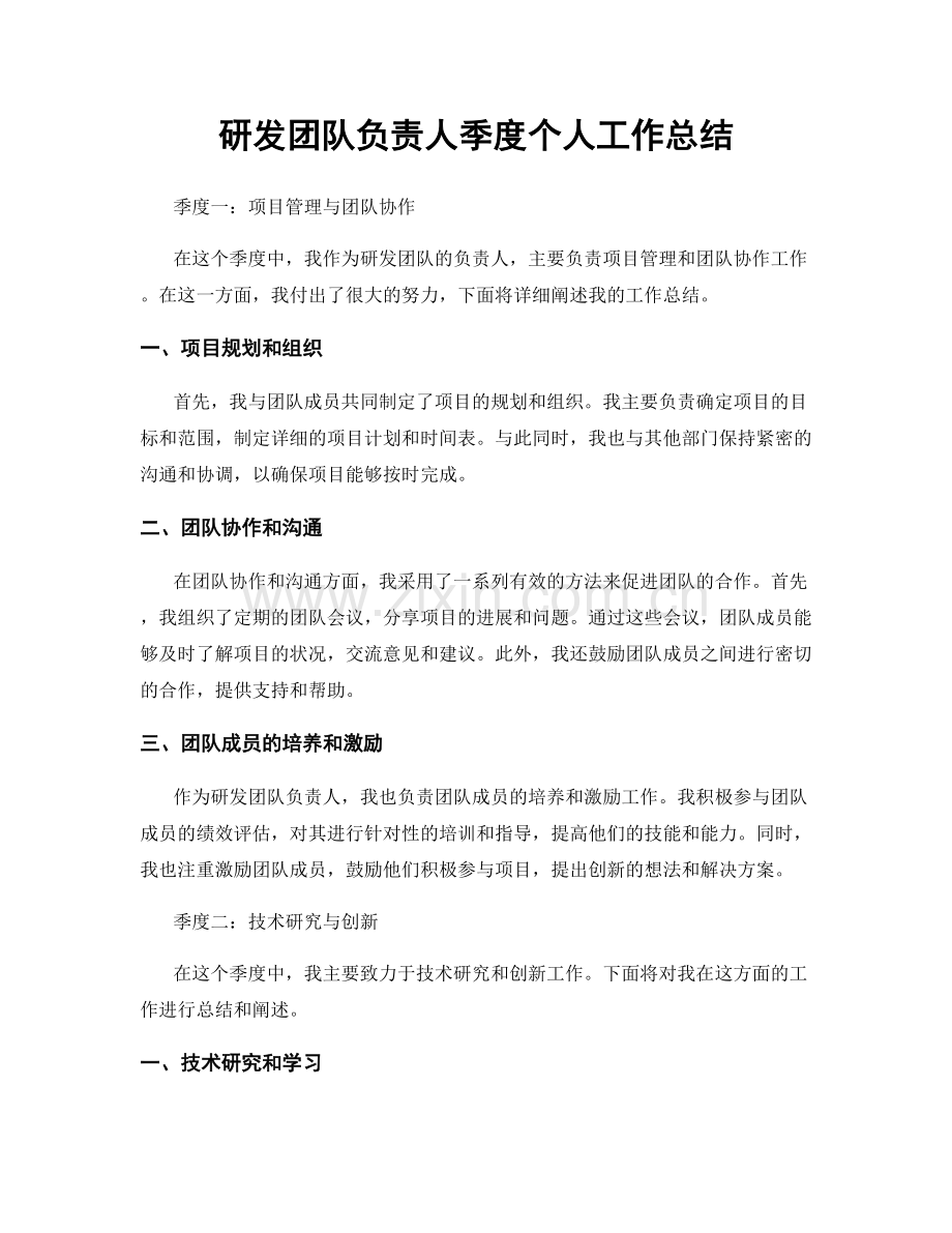 作为研发团队负责人,我在这个季度中承担了不同的角色和责任。通过项目管理和团队协作,我确保项目的顺利进行;通过技术研究和创新,我提高了团队的竞争力和创新能力;通过项目成果和团队成绩的关注,我取得了令人满意的成绩。在接下来的工作中,我将继续努力,不断提高自己的能力和团队的整体绩效。