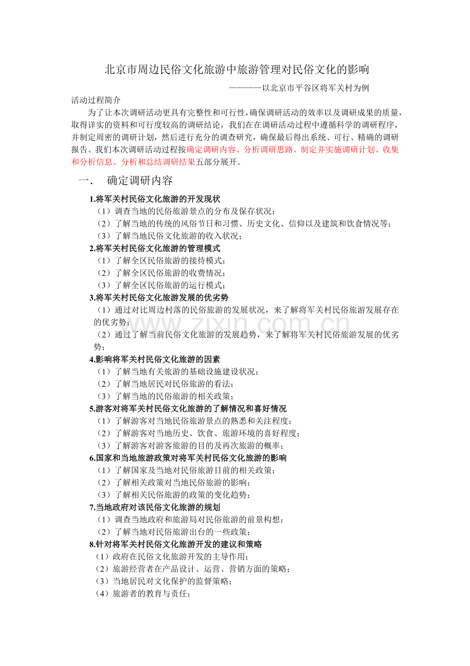 本次我们调研通过对当地民俗文化旅游资源的开发状况、旅游管理模式、游客的喜好程度、民俗旅游的相关政策以及规划来了解和研究平谷区将军关村民俗文化旅游中旅游管理对民俗文化的影响,进一步在了解当前全国范围内民俗文化旅游地区旅游管理对民俗文化的影响,从而达到对民俗文化更好地管理和开发。