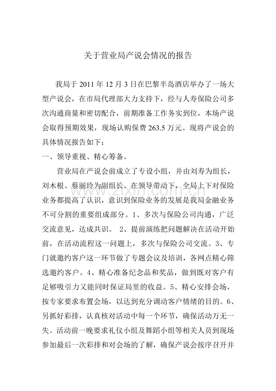 我局于2011年12月3日在巴黎半岛酒店举办了一场大型产说会,在市局代理部大力支持下,经与人寿保险公司多次沟通商量和密切配合,前期准备工作务实到位,本场产说会取得预期效果,现场认购保费263.5万元。现将产说会的具体情况报告如下: