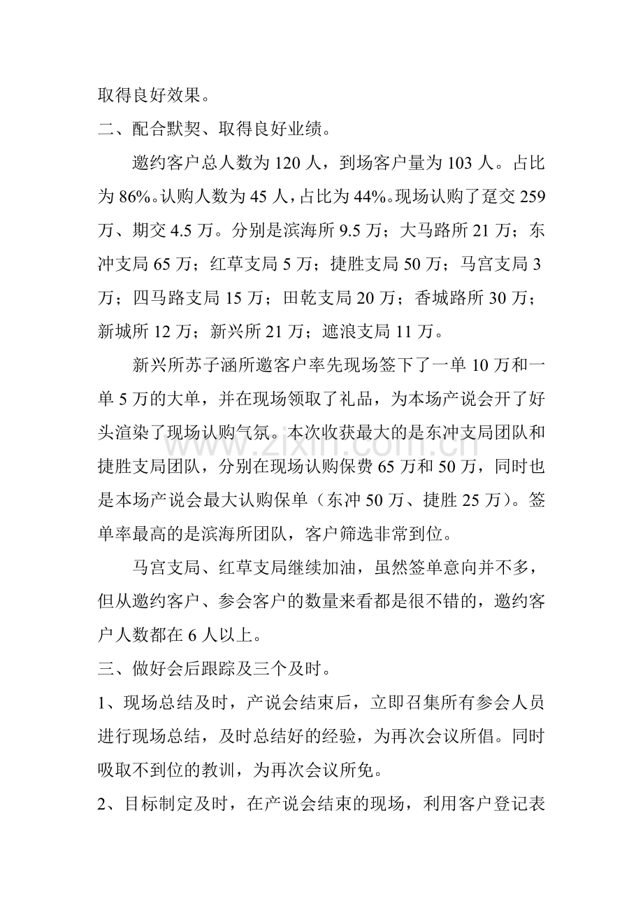 1、 现场总结及时,产说会结束后,立即召集所有参会人员进行现场总结,及时总结好的经验,为再次会议所倡。同时吸取不到位的教训,为再次会议所免。