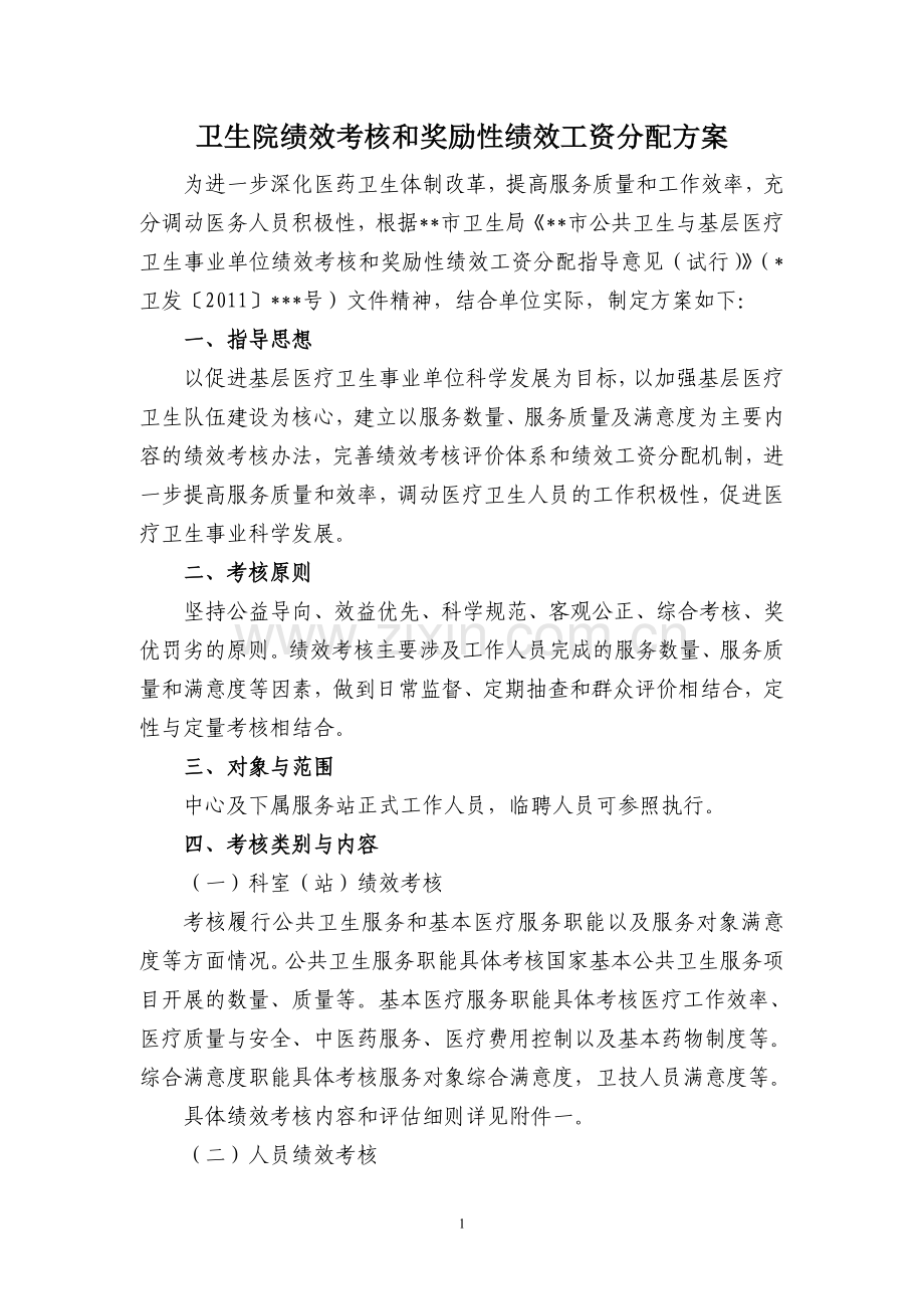 为进一步深化医药卫生体制改革,提高服务质量和工作效率,充分调动医务人员积极性,根据**市卫生局《**市公共卫生与基层医疗卫生事业单位绩效考核和奖励性绩效工资分配指导意见(试行)》(*卫发〔2011〕***号)文件精神,结合单位实际,制定方案如下: