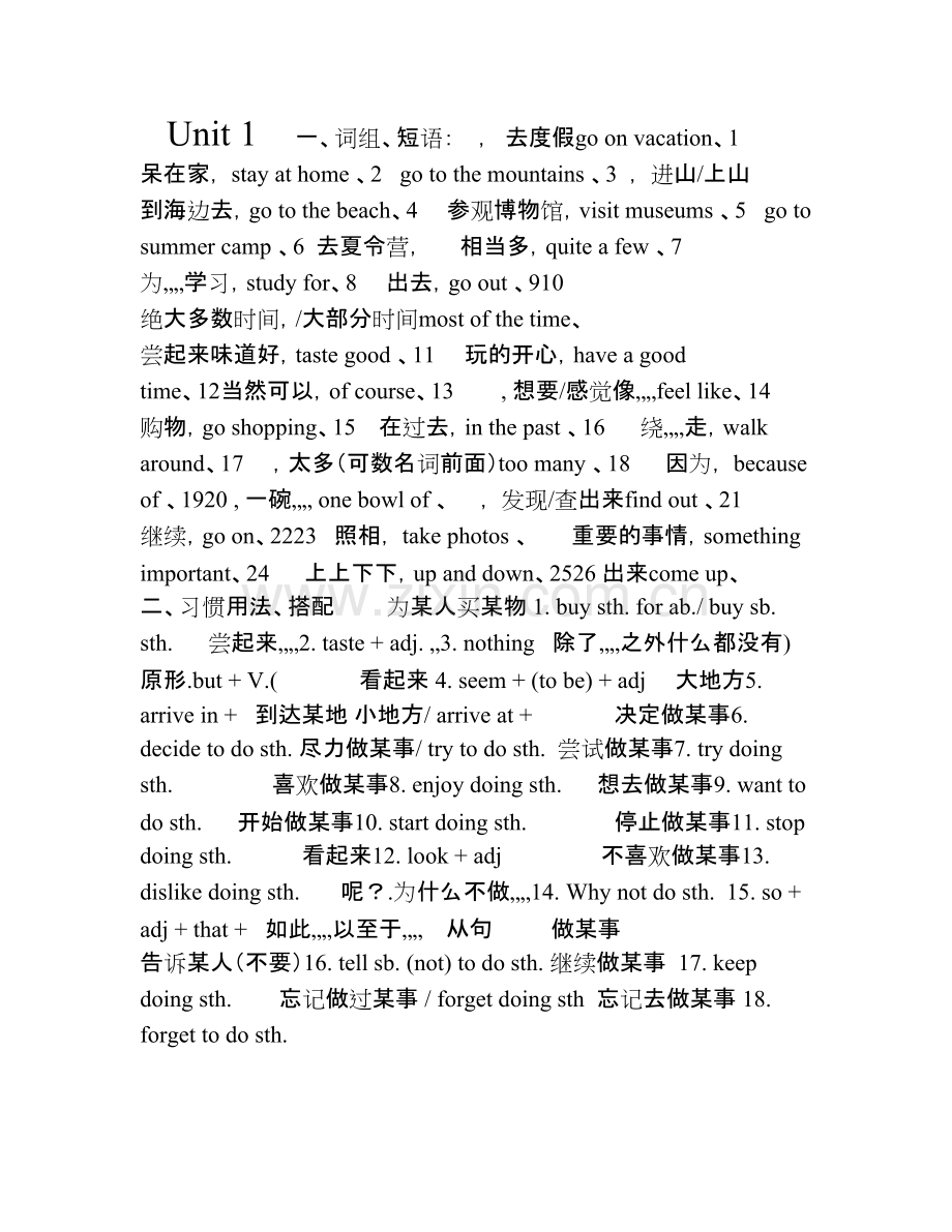 Unit 1 一、词组、短语:,去度假go on vacation、1 呆在家,stay at home、2 go to the mountains、3 ,进山/上山 到海边去,go to the beach、4 参观博物馆,visit museums、5 go to summer camp、6 去夏令营,相当多,quite a few、7 为学习,study for、8 出去,go out、910 绝大多数时间,/大部分时间most of the time、尝起来味道好,taste good、11 玩的开心,have a good time、12当然可以,of course、13 ,想要/感觉像feel like、14 购物,go shopping、15 在过去,in the past、16 绕走,walk around、17 ,太多(可数名词前面)too many、18 因为,because of、1920,一碗 one bowl of、,发现/查出来find out、21 继续,go on、2223 照相,take photos、重要的事情,something important、24 上上下下,up and down、2526 出来come up、二、习惯用法、搭配 为某人买某物 1.buy sth.for ab./buy sb.sth.尝起来2.taste+adj.3.nothing 除了之外什么都没有)原形.but+V.(看起来 4.seem+(to be)+adj 大地方5.arrive in+到达某地 小地方/arrive at+决定做某事6.decide to do sth.尽力做某事/try to do sth.尝试做某事7.try doing sth.喜欢做某事8.enjoy doing sth.想去做某事9.want to do sth.开始做某事10.start doing sth.停止做某事11.stop doing sth.看起来12.look+adj 不喜欢做某事13.dislike doing sth.呢?.为什么不做14.Why not do sth.15.so+adj+that+如此以至于 从句 做某事 告诉某人(不要)16.tell sb.(not)to do sth.继续做某事 17.keep doing sth.忘记做过某事/forget doing sth 忘记去做某事 18.forget to do sth.三、重点句子 你去哪儿度假的?1.Where did you go on vacation?Where引导的特殊疑问句。where)这是一个由疑问副词1 用来询问地点或场所,用于句首,其后跟一般疑问句。?Where does he live?Where are you from如:)2 ”“去度假go on vacation 他要和家人一起度假。He will go on vacation with his family.假期n n kevacation v【解析】=holiday 去度假take a vacation 在度假on vacation 暑假summer vacation 寒假winter vacation I have a lot of _every year.(vacation)(She went to America.Where did Sarah go on vacation?on vacation A.D.is for vacation C.is on vacation B.take a vacation 你和别人一起去的吗?Did you go with anyone?、2,did这是一个一般过去时的一般疑问句。当含有实义动词的一般过去时的陈述句变为一般疑问句时,需借助助动词,肯定回答为“其它?”+动词原形+主语did+此时后面的实义动词应用原形。其句型结构为“,否定回”+did主语Yes,”t+didn主语No,答为“基本用法 ,通常用在否定句、疑问句或条件从句中。anybody任何人,相当于pron.anyone 我不会告诉任何人我在这儿见过你。t tell anyone I saw you here.I won 如:为什么会有人想要那份工作呢?Why would anyone want that job?同类词-知识拓展 Some every-no-any-everybody 人人everyone nobody 没有人no one anybody 任何人anyone 有人someone 指人 一切事everything 没有事nothing 任何事anything 某物something 指物 到处everywhere 无处,没有地方nowhere 任何地方anywhere 某地somewhere 指地点 注意:构成的符合不定代词作主语时,都作单数看待,其谓语动词用第三人称单数形式。some-,any-,no-,every-由(1)不定代词若有定语修饰,该定语要置于其后,作后置定语。(2)如:我想要些喝的。d like something to drink.I这本书中有有趣的东西吗?Is there anything interesting in the book?everyone evriw 任何人n pron anyone eniw某人n pron mwsomeone s】1【解析小结:每人,人人n pron 看望了我的叔叔 3.visited my uncle 还可以意为“参观;游览”visit 后接表示人的名词或代词。,是及物动词,意为“拜访;探望”visit,后接表示地点 的名词。了我的外婆。_上周我去 I visited my grandmother last week.a.b.Do you want to visit Shanghai?b.上海吗?_你想 。意为“参观者;游客”visitor拓展:These visitors come from America._ )P2(买特别的东西。3.buy anything special 。_。其过去式为及物动词,意为“买;购买”buy)1 My uncle_ _a bike.=My uncle_ _for me.。意为“给某人买某物”buy sth.for sb.=buy sb.sth.拓展:,主要用于疑问句或否定句中。不定代词,意为“某事;某件东西”anything 2)a.t say anything about it.b.I can Do you want to buy anything for me?3),形容词修饰不定代词时后置。表示“特别的东西”anthing special 这本书里有新的内容吗?Is there_ _in this book?)P2哦,你去有趣的地方了吗?(4.Oh,did you go anywhere interesting?开头的一般疑问句did)本句是1anywhere)2 。用作副词,意为“在任何地方”somewhere 与anywhere辨析:?Did you go anywhere during the summer vacation:eg ,常用于否定句和疑问句中。意为“在任何地方”anywhere t find it anywhere.eg:I can eg:I lost my key somewhere near here.,常用于肯定句中。意为“在某处;到某处”somewhere )P2(我们在那里拍了不少照片。5.We took quite a few photos there.我们在长城上照了相。eg:We_ _on the Great Wall.。意为“照相;拍照”take photos quite a little 与quite a few辨析:,修饰可数名词复数;不少”;意为“很多quite a few ,修饰不可数名词。不少”;意为“很多quite a little a.He stays here for _ _ _days.瓶子b.There is _ _ _water in the bottle().)P2(我大部分时间只是待在家里读书休息。6.I just stayed at home most of the time to read and relax.为代词,意为“大部分;大多数”most,其中意为“大部分时间”most of the time 意为“中的大多数”most of拓展 后所修饰的名词。most of,它作主语时,谓语动词取决于 我们大多数人要去公园。a.Most of us_(be)going to the park.大部分的食物都变质了。b.Most of the food_(go)bad.)P3(所有的东西尝起来真的很好吃!Everything tasted really good!7.,其后接形容词构成系表结构。在此为系动词,意为“尝起来”taste 食物尝起来棒极了