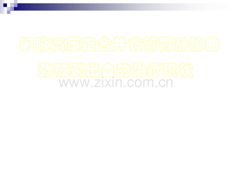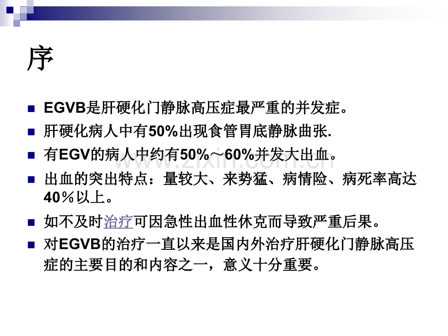 门脉高压症合并食管胃静脉曲门脉高压症合并食管胃静脉曲张破裂出血的治疗现状张破裂出血的治疗现状序序nEGVB是肝硬化门静脉高压症最严重的并发症。是肝硬化门静脉高压症最严重的并发症。n肝硬化病人中有肝硬化病人中有50%出现食管胃底静脉曲张出现食管胃底静脉曲张.n有有EGV的病人中约有的病人中约有50%60%并发大出血。并发大出血。n出血的突出特点:量较大、来势猛、病情险、病死率高达出血的突出特点:量较大、来势猛、病情险、病死率高达40以上。以上。n如不及时如不及时治疗治疗可因急性出血性休克而导致严重后果。可因急性出血性休克而导致严重后果。n对对EGVB的治疗一直以来是国内外治疗肝硬化门静脉高压的治疗一直以来是国内外治疗肝硬化门静脉高压症的主要目的和内容之一,意义十分重要。症的主要目的和内容之一,意义十分重要。食管胃静脉曲张破裂出血食管胃静脉曲张破裂出血(Esophageal gastric variceal bleeding,EGVBEsophageal gastric variceal bleeding,EGVB)门静脉高压症压力门静脉高压症压力过高过高时,导致时,导致食管和食管和/或胃底或胃底V V曲张破裂的曲张破裂的出血出血.EGVB的定义的定义 门脉阻力门脉阻力 和或和或 PHT 门脉血流量门脉血流量n肝内血流阻力肝内血流阻力 PHTPHT始动因素始动因素n门脉血流量门脉血流量 PHTPHT重要因素重要因素n内脏血流量内脏血流量 PHTPHT维持因素维持因素 内脏血管扩张内脏血管扩张 心输出量心输出量 血容量血容量门脉高压症形成的基础门脉高压症形成的基础n破裂学说:破裂学说:静脉壁张力直径静脉壁张力直径压力压力曲张静脉直径曲张静脉直径曲张静脉内压力曲张静脉内压力n糜烂学说:糜烂学说:尚未被组织学证实尚未被组织学证实溃疡形成溃疡形成酸反流酸反流EGVB的发生机制:的发生机制:l来势凶猛,出血量大,来势凶猛,出血量大,病情危重,死亡率高。病情危重,死亡率高。EGVB的特点:的特点:n 呕血、黑便、便血和周围循环衰竭。呕血、黑便、便血和周围循环衰竭。l是目前最常见、最危急、死亡率最高,是目前最常见、最危急、死亡率最高,且是需紧急抢救的内科急症之一!且是需紧急抢救的内科急症之一!EGVB的特征:的特征:n肝硬化肝硬化患者约患者约50有有EGV。EV发生与肝病程度相关:发生与肝病程度相关:nChild A级患者级患者40发生;发生;nchild C级患者高达级患者高达85。n无无V曲张曲张LC者每年有者每年有8%出现静脉曲张;出现静脉曲张;n轻度曲张者每年有轻度曲张者每年有8%发展为重度曲张。发展为重度曲张。nV曲张出血的发生率每年约为曲张出血的发生率每年约为5%15%。2007年美国肝硬化胃食管静脉曲张及出血的防治指南静脉曲张的自然病程:静脉曲张的自然病程:l酒精性肝硬化酒精性肝硬化EGV(50%)EGV(7080%)l肝炎后肝硬化肝炎后肝硬化EGV(30%)2 Y6 Y7-8 Y V曲张程度:最重要。曲张程度:最重要。肝硬化分级:肝硬化分级:Child B/C。内镜下表现:有红色征。内镜下表现:有红色征。预测出血的重要因素预测出血的重要因素:n门脉压力门脉压力(HVPG1.6kPa(HVPG1.6kPa或或12mmHg)12mmHg)内镜见重度内镜见重度EGVEGVn血容量血容量 临床见严重腹水、浮肿。临床见严重腹水、浮肿。n曲张静脉张力曲张静脉张力 (曲张静脉内压食管腔内压曲张静脉内压食管腔内压)x()x(血管半径血管半径/管壁厚管壁厚度度)。内镜见红色征内镜见红色征n肝功能差肝功能差(Child C)Child C)、持续饮酒持续饮酒EGVB的征兆的征兆:n自然止血率自然止血率:可达:可达40%;n 6 周死亡率周死亡率:虽治疗技术进步,但仍有:虽治疗技术进步,但仍有20%。n初次出血死亡率初次出血死亡率40%40%。n60%60%幸存者幸存者 再次出血再次出血n再次出血死亡率(再次出血死亡率(303050%50%)2W-6MEGVB的预后的预后:HVPG(出血后出血后24内测定内测定):20mmHg者者1.早期再发出血早期再发出血(住院住院1周内周内)较高:较高:83%;2.止血失败的风险较高:止血失败的风险较高:29%;3.1年死亡率远高于较低者:年死亡率远高于较低者:64%vs20%;4.未治患者约未治患者约60%发生迟发再出血发生迟发再出血(大多发生在大多发生在标志出血后的标志出血后的12年内年内)。EGVBEGVB后一年生存率仅为后一年生存率仅为32%32%80%80%。Ala S:N Engl Med.2001HVPG对预后的影响对预后的影响:n临床表现:临床表现:罹患门静脉高压症罹患门静脉高压症患者出现:患者出现:n呕血或呕血或/和黑便和黑便(便血便血),伴周围循环衰竭,伴周围循环衰竭征象;征象;除外除外PHG、HU、口鼻咽部或呼吸道病变、口鼻咽部或呼吸道病变出血;出血;除外除外服用某些药物及食物等。服用某些药物及食物等。EGVB的诊断依据的诊断依据:n内镜检查:内镜检查:见有食管或胃曲张见有食管或胃曲张静脉出血。静脉出血。或见粗大曲张静脉或见粗大曲张静脉和胃内血液且无它和胃内血液且无它因可识别的出血。因可识别的出血。EGVEGV的治疗原则的治疗原则n急性出血的治疗急性出血的治疗n预防初次出血:一级预防预防初次出血:一级预防n预防再出血:预防再出血:二级预防二级预防重复套扎重复套扎/硬化疗法硬化疗法,TIPS.急性上消化道出血的治疗指南急性上消化道出血的治疗指南 上消化道出血的患者疑为食道静脉曲张出血上消化道出血的患者疑为食道静脉曲张出血静脉给予静脉给予思他宁思他宁急症内镜检查急症内镜检查非曲张