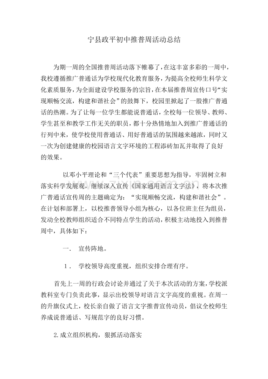 我们根据县局有关会议,及时传达会议精神及时成立宁县政平初中推普活动领导小组,组长:袁正恒,副组长,杨忠亲,组员由各班主任组成,具体指导、组织本次推普活动的组织领导与具体实施。
