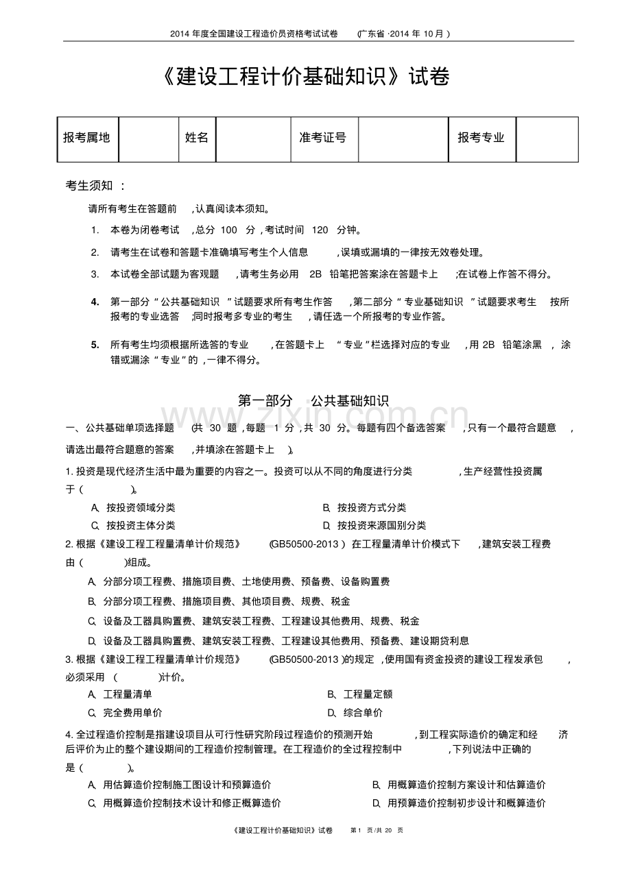 2014 年度全国建设工程造价员资格考试试卷(广东省 2014 年 10 月)建设工程计价基础知识试卷报考属地姓名准考证号报考专业考生须知:请所有考生在答题前,认真阅读本须知。1.本卷为闭卷考试,总分 100 分,考试时间 120 分钟。2.请考生在试卷和答题卡准确填写考生个人信息,误填或漏填的一律按无效卷处理。3.本试卷全部试题为客观题,请考生务必用 2B 铅笔把答案涂在答题卡上;在试卷上作答不得分。4.第一部分“公共基础知识”试题要求所有考生作答,第二部分“专业基础知识”试题要求考生按所报考的专业选答;同时报考多专业的考生,请任选一个所报考的专业作答。5.所有考生均须根据所选答的专业,在答题卡上“专业”栏选择对应的专业,用 2B 铅笔涂黑,涂错或漏涂“专业”的,一律不得分。第一部分公共基础知识一、公共基础单项选择题(共 30 题,每题1 分,共 30 分。每题有四个备选答案,只有一个最符合题意,请选出最符合题意的答案,并填涂在答题卡上)。1.投资是现代经济生活中最为重要的内容之一。投资可以从不同的角度进行分类,生产经营性投资属于()。A、按投资领域分类B、按投资方式分类C、按投资主体分类D、按投资来源国别分类2.根据建设工程工程量清单计价规范(GB50500-2013),在工程量清单计价模式下,建筑安装工程费由()组成。A、分部分项工程费、措施项目费、土地使用费、预备费、设备购置费B、分部分项工程费、措施项目费、其他项目费、规费、税金C、设备及工器具购置费、建筑安装工程费、工程建设其他费用、规费、税金D、设备及工器具购置费、建筑安装工程费、工程建设其他费用、预备费、建设期贷利息3.根据建设工程工程量清单计价规范(GB50500-2013)的规定,使用国有资金投资的建设工程发承包,必须采用()计价。A、工程量清单B、工程量定额C、完全费用单价D、综合单价4.全过程造价控制是指建设项目从可行性研究阶段过程造价的预测开始,到工程实际造价的确定和经济后评价为止的整个建设期间的工程造价控制管理。在工程造价的全过程控制中,下列说法中正确的是()。A、用估算造价控制施工图设计和预算造价B、用概算造价控制方案设计和估算造价C、用概算造价控制技术设计和修正概算造价D、用预算造价控制初步设计和概算造价建设工程计价基础知识试卷第 1 页/共 20 页2014 年度全国建设工程造价员资格考试试卷(广东省 2014 年 10 月)5.工程竣工验收时,项目发生了重大改变,但其原因不属于设计单位和施工承包单位,根据绘制竣工图的规定,下列说法正确的是()。A、由设计单位负责重新绘图B、由施工承包单位负责重新绘图C、由业主自行绘图D、由施工承包单位在原施工图(蓝图)上注明修改部分,并附以施工说明即可6.工程造价的有效控制就是采取一定的方法和措施把建设项目投资的发生控制在批准的投资额度以内。在初步设计阶段,以()为控制目标控制和修改初步设计。A、合同价B、设计概算C、结算价D、投资估算7.建筑产品的价格由()组成。A、直接费、利润、税金B、生产成本、利润、税金C、间接费、利润、税金D、分部分项工程费、利润、税金8.工程建设定额中分项最细,定额子目最多的一种定额,也是工程建设定额中的基础性定额的是()。A、概算定额B、预算定额C、施工定额D、估算指标9.施工成本是从项目经理部的角度来定义的,只包括现场的施工队伍所发生的各种费用,由()组成。A、人工费、材料费、机械费、现场经费B、材料费、机械费、现场经费、间接费C、材料费、机械费、现场经费、利润D、直接费、管理费、利润、流转税及附加10.根据成本管理要求,工程成本可分为预算成本、计划成本和实际成本,以下说法中错误的是()。A、实际成本是工程项目在报告期内实际发生的各项生产费用的综合B、把实际成本与预算成本相比,可揭示成本的节约与超支C、计划成本和实际成本反映的都是施工企业成本水平,受企业本身的生产技术、施工条件及生产经营管理水平所限制D、工程计划成本是施工项目经理部根据计划期的有关资料,在实际成本发生前预先计算的成本水平11.某工程承包人投标报价中的材料 A 单价为 120 元/m3,而投标报价时该材料的基准单价为 128 元/m3,施工期间该材料的单价上涨到 137 元/m3,根据建设工程工程量清单计价规范(GB50500-2013),在确定合同价款调整时,该材料的涨幅为()。A、7.03%B、7.5%C、13.28%D、14.17%12.某工程发包人供应到现场的建筑材料总价值为 15.6 万元,合同约定这些材料由承包人负责保管,根据广东省建设工程计价通则(2010)规定,承包人可收取的保管费为()元。A、2340B、3120C、3900D、156012.13.根据广东省建设工程计价通则(2010),工程计价时下列各项费用中,应由承包人承担全部风险的是()。A、规费B、人工费C、利润D、安全文明施工费14.工程造价咨询单位资质等级在专业技术负责人、专业技术人员、注册资金、历史业绩和社会信誉等方 面都有具体要求,其中甲级工程造价咨询企业资质标准,要求技术负责人应从事工程造价主要工作()年以上,专职从事工程造价专业工作的人员不少于()人。A、10;10B、10;20C、15;15D、15;20 15.工程计价是按工程分解结构进行的。一个建设项目可以分解为单项工程、单位工程、分部工程和分项工程,下列属于分部工程的是()。A、1 号教学楼B、楼内的给排水工程C、