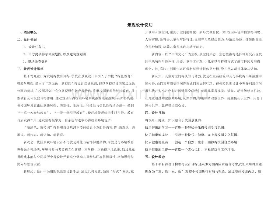 基于项目得设计构思与设计目标,遵从多方面得因素结合考虑,我们采用得主题理念为“寓、教、娱、乐”,对整个校园进行布局与塑造。通过安排校园内点、线、面结合得景观体系,构成校园得空间系统,以建设园林式、人文式校园为目标。