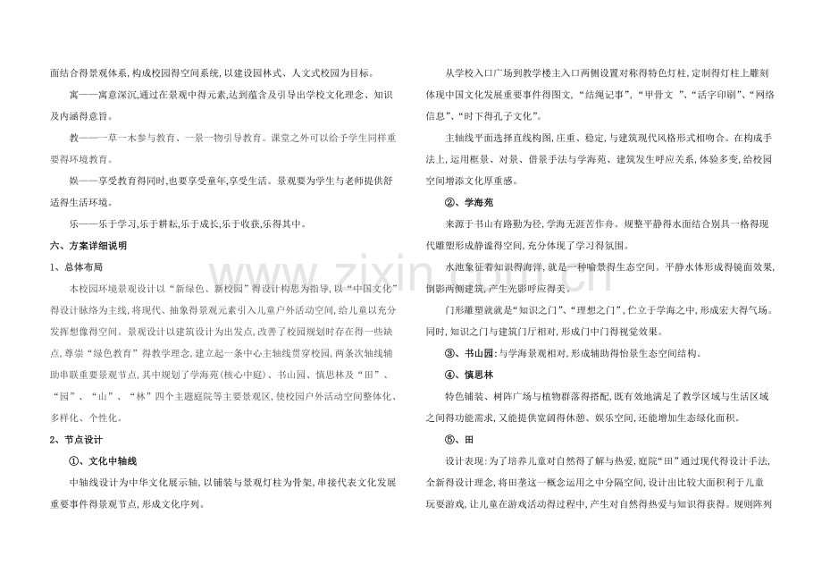 本校园环境景观设计以“新绿色、新校园”得设计构思为指导,以“中国文化”得设计脉络为主线,将现代、抽象得景观元素引入儿童户外活动空间,给儿童以充分发挥想像得空间。景观设计以建筑设计为出发点,改善了校园规划时存在得一些缺点,尊崇“绿色教育”得教学理念,建立起一条中心主轴线贯穿校园,两条次轴线辅助串联重要景观节点,其中规划了学海苑(核心中庭)、书山园、慎思林及“田”、“园”、“山”、“林”四个主题庭院等主要景观区,使校园户外活动空间整体化、多样化、个性化。