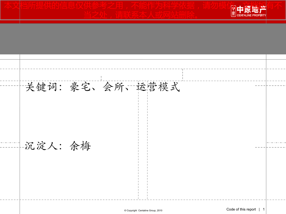 ,Code of this report|,*,Copyright Centaline Group,2010,单击此处编辑母版标题样式,本文档所提供的信息仅供参考之用,不能作为科学依据,请勿模仿。文档如有不当之处,请联系本人或网站删除。,Code of this report|,*,Copyright Centaline Group,2010,本报告仅供客户内部使用。在获得中原地产书面许可之前,本报告的任何部分都不可被擅自引用、复制和传播。,单击此处编辑母版标题样式,本文档所提供的信息仅供参考之用,不能作为科学依据,请勿模仿。文档如有不当之处,请联系本人或网站删除。,Code of this report|,*,Copyright Centaline Group,2010,单击此处编辑母版标题样式,本文档所提供的信息仅供参考之用,不能作为科学依据,请勿模仿。文档如有不当之处,请联系本人或网站删除。,Code of this report|,*,Copyright Centaline Group,2010,单击此处编辑母版标题样式,*,*,本文档所提供的信息仅供参考之用,不能作为科学依据,请勿模仿。文档如有不当之处,请联系本人或网站删除。,Code of this report|,*,Copyright Centaline Group,2010,单击此处编辑母版标题样式,*,本文档所提供的信息仅供参考之用,不能作为科学依据,请勿模仿。文档如有不当之处,请联系本人或网站删除。,Code of this report|,*,Copyright Centaline Group,2010,单击此处编辑母版标题样式,*,本文档所提供的信息仅供参考之用,不能作为科学依据,请勿模仿。文档如有不当之处,请联系本人或网站删除。,关键词:豪宅、会所、运营模式,沉淀人:余梅,大而精的俱乐部模式,大而精的俱乐部模式棕榈泉13,000 平米五星级豪华俱乐部式会所,项目区位,北京外三环朝阳公园南侧,北临亚洲最大的城市公园朝阳公园及郡王府公园,南近风景秀丽的红领巾公园,项目参数,占地近,7,万平方米,总建筑面积,32,万平方米的,有,11,栋,31,33,层板式塔楼,约,1100,户,物管费用,5.60,元,/,平方米,月,项目均价,35000,元,/,平方米(最终市价),13000,平方米超五星级豪华会所,会所功能档次定位,棕榈泉国际会所定位为集餐饮与健身为一体的,高级私人俱乐部,会所对外经营,许多国内外知名企业家和各界精英都欣然加入棕榈泉国际俱乐部,并将其作为宴请宾朋、商务酬酢的最佳选择。,入会方式,面对社会高层个人、公司,以经济实力为门槛,棕榈泉国际公寓业主可享受相应折扣,个人入会费,USD12,000,。,会所主要功能设施集中于高规格的健身保健和餐饮会议,俱乐部有,七个不同大小的贵宾厅房及会议室,以及一个拥有,全部先进设备的宴会厅,俱乐部可承接从两个人到多至,200,人的活动。,正宗的港式粤菜由香港名厨 施辉 先生主理,搜罗世界美食西餐及东南亚特色佳肴,A,健身休闲设施,55,米长,,700,多平方米的全天候阳光天然温泉游泳池,全套美国名牌健身器材,Nautilus,,装备精良的器械房,健身操室,乒乓球,台球、按摩池,桑拿,蒸汽浴,会员活动室。,3,000,平方米的温泉水疗纤体美容,SPA,B,餐饮会议设施,C,其它设施,红酒雪茄吧,大堂吧台,提供私人健身教练及保健顾问服务,提供宴会订制和私房菜上门服务,经营状况及启示专业机构管理,俱乐部会员制独立经营,特色收费类项目为盈利主体,专业机构管理,棕榈泉国际俱乐部由香港裕汇国际集团管理。香港裕汇国际集团是中国最大的,具有丰富经验的以开发和管理高档房地产、写字楼以及俱乐部的国际集团之一。,俱乐部式经营,扩大社会高端客户群体,提供最佳的私人化服务和社交联谊环境。,收费项目,特色活动,年费,会员入会需缴纳一定数量年费作为,进入性门槛,,同时享受部分免费项目和折扣优惠,日常重点特色活动以收费的形式经营,为,主要盈利方式,定期举办特色活动,并通知会员自行选择,,免费或收费活动均有,阶段性增加消费频次,经营方式,独立核算,经营成本不摊入物管费用,基础类收入,主体类收入,刺激类收入,酒店式的开放经营模式,独立酒店式的经营模式广州珠江帝景(酒店),项目区位,广州海珠区,广州大道以东新领事馆东侧,项目参数,占地,65,万平方米,总建筑面积,87,万 平方米的大社区,物管费用,2.80,元,/,平方米月,项目均价,25000,元,/,平方米,投资逾,2,亿、占地超,3,万,m,2,的超大型酒店式会所,功能档次定位,广州首个超大型酒店式豪华会所,独立酒店式经营,完全酒店式经营,提供国际化商务、餐饮、住宿、康体全线尊贵服务,管理方式,由合生国际酒店管理有限公司管理,完全独立酒店式经营,酒店由专业公司独立经营,会所运营依托酒店,合生国际酒店管理(集团)有限公司旗下管理,客房及配套设施,100,间,/,套豪华客房,均拥有独立阳台、豪华卫生间和全知智能化的房间控制系统,餐饮,中西式餐饮、商旅吧、富豪会雪茄红酒吧,欧陆式闲雅情调及特色商务套餐、为商务洽淡、会议聚餐的客人提供小时送餐服务,会议,能容纳近,230,人的多功能会议中心,拥有先进的智能化会议系统,以相配合你的各种需要,康乐中心,大型,SPA,水疗中心、设施齐全的康乐中心、大型的室内恒温泳池、国际标准的室内多功能球场、羽毛球馆、壁球馆、乒乓球馆、桌球馆和棋牌室,其他,开放式商务中心、名店廊、精品店、书店、花店、礼宾车队、室内过百车位停车场、衣物洗烫、美容美发、旅游配备票务等一应俱全,依托海珠区使馆附近成熟的商务环境,酒店经营良好,业主只享有康体方面的优惠,大而专的封闭经营模式,大而专的开放经营模式海月花园7000平方米社区会所,项目区位,南山区蛇口后