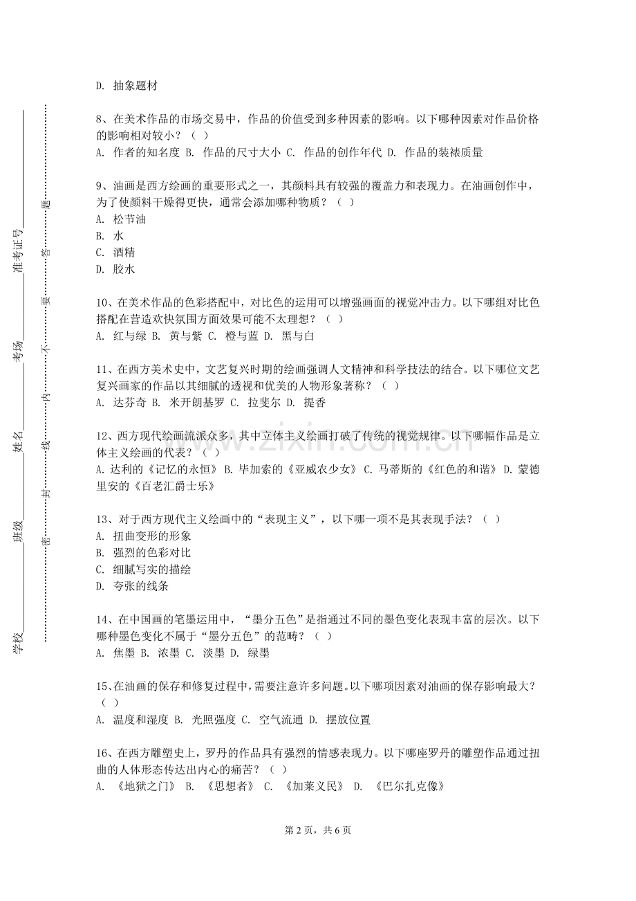 24、美术作品的收藏和保护对于传承文化具有重要意义。在收藏美术作品时,需要考虑哪些因素?( )