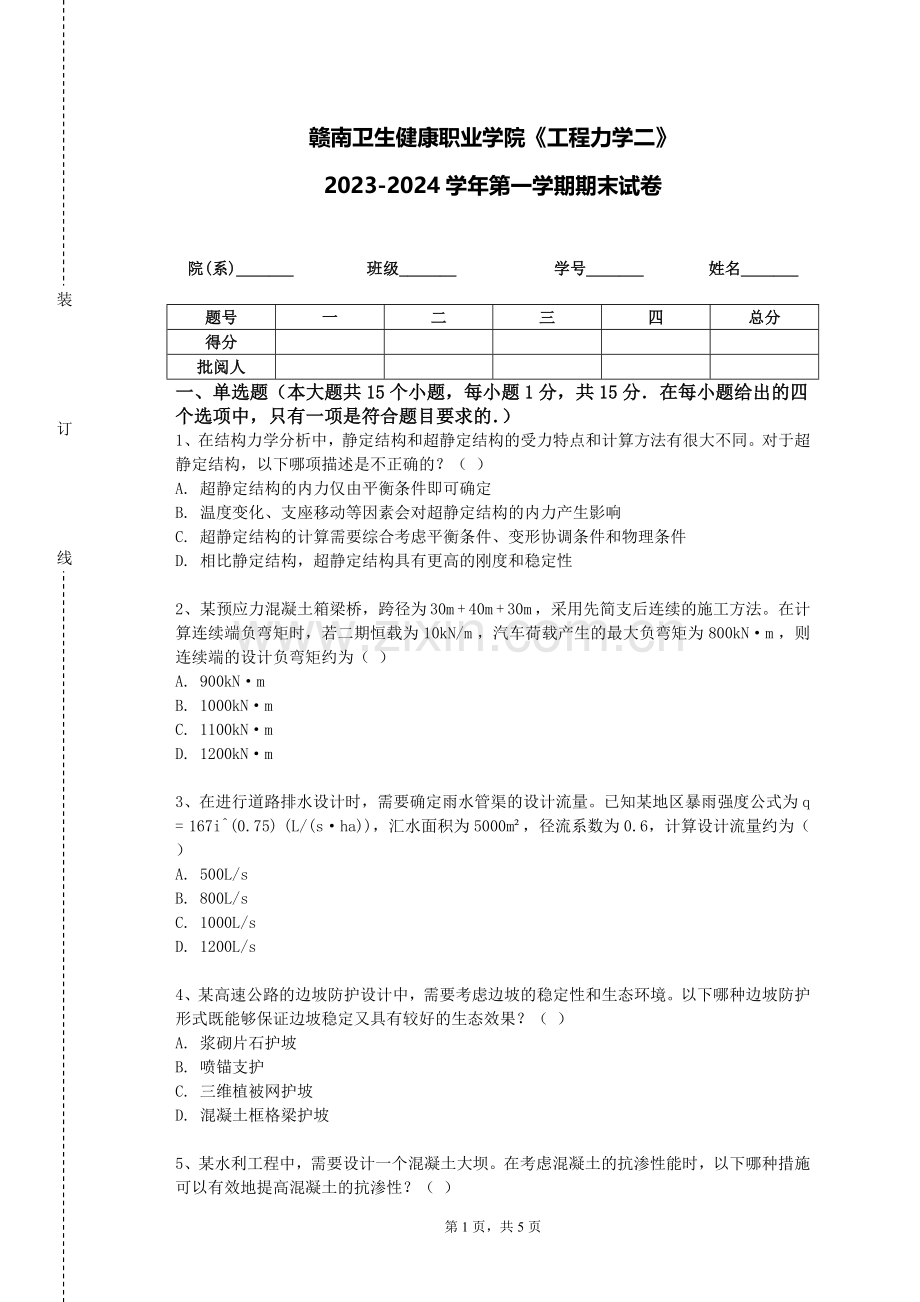 2、(本题10分)一座跨越河流的公路桥梁,由于长期受到超载车辆和恶劣环境的影响,出现了主梁裂缝和桥墩沉降等问题。分析产生这些病害的原因,评估桥梁的安全性,探讨可行的加固修复方案以及后续的养护管理措施。