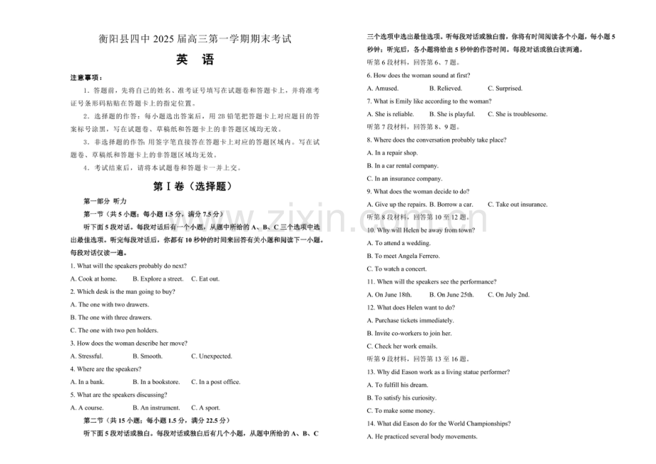 湖南省衡阳市衡阳县第四中学2025届高三上学期1月期末考试-英语试卷(含答案).docx_第1页