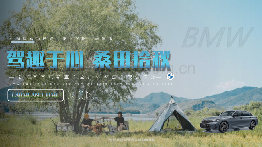 宝马某 某 店 新 享 之 旅 户 外 农 场 自 驾 游 活 动小 桑 田 农 场 探 趣,慢 下 来 的 才 是 生 活BMWBMWBMW Baoxiang New Journey Outdoor Farm Self Driving TourCONTENTCONTENTPART ONE策略思考PART ONE活动推广PART ONE内容规划PART ONE其它事项1234目 录1 1创意思考 activity thinking activity thinkingBMW Baox i ang New J our ney Out door Far m Sel f Dr i vi ng TourLIFE LIFE WITH BMWWITH BMW2022.10.22LIFEISFLSEWHEREWHATCANWEDO核心诉求如何筹备此场客户体验活动轻松写意的游玩体验过程中,让参与者留下诸多记忆点,以达到深度体验的目的,进而将BMW品牌理念植入人心。互 动 体 验 认 可对于成年人来说田园牧歌,是成年人回归生活与寻求内心宁静时难得的栖息地田园牧歌,是成年人回归生活与寻求内心宁静时难得的栖息地这里没有压力与烦恼,有的只是儿时的欢乐这里没有压力与烦恼,有的只是儿时的欢乐对于小朋友来说乡间野趣,是弥补孩子们童年生活中可能会缺失的田园风光与乡间野趣,是弥补孩子们童年生活中可能会缺失的田园风光与令人沉醉的果蔬花香、炊烟渺渺,感受万物生长的生命力令人沉醉的果蔬花香、炊烟渺渺,感受万物生长的生命力创意引导创意引导驾一台好车,沿着农场自在巡游,风声摇曳,灌入耳内,同时也将喧闹人声抛于脑后。踏马寻花,抛洒流光,带着家人和孩子去感受重庆秋日的多彩和阳光的温暖,是开拓视野和亲近大自然的好机会。活动的每一部分都将以BMW的人文基调、品牌认知、圈层文化为核心,突出表现BMW的驾乘乐趣与能带给车主的圈层生活品质,进而在客户心目中产生更深层次的化学反应。一次与不一样的生活方式(LifeStyle)相关联的田园牧歌,一场提高客户对BMW圈层文化、品牌认知的探索之旅。LIFE LIFE WITH BMWWITH BMW活动规划活动规划怎样区分与其他品牌千篇一律的自驾活动形式?打造专属于BMW的主题体验活动?我们将择址重庆最具诗意的网红农场小桑田,与客户共绘一卷古中国山水田园诗,聆听山野中、农场外的森呼吸。氛围布置活动内容整体氛围布置与场地原有装饰相结合,自然融入BMW相关元素,创意打卡点、专属接待处等氛围布置彰显品质与格调通过自驾环节、宣讲环节、互动环节、农场体验环节等让BMW所倡导的生活方式深入人心,进而有所认知也保持好奇LIFE LIFE WITH BMWWITH BMW2 2活动推广 activity thinking activity thinkingBMW Baox i ang New J our ney Out door Far m Sel f Dr i vi ng TourLIFE LIFE WITH BMWWITH BMW2022.10.22LIFEISFLSEWHERE传播节奏传播规划前期预热活动期间线上线下后期延续驾趣于心 桑田拾秋 宝马某某店新享之旅户外农场自驾游活动公众号推文公众号推文先导视频先导视频活动招募推文活动招募推文活动招募长图活动招募长图活动海报活动海报合作媒体矩阵、某某店自有宣传渠道活动朋友圈九宫格活动朋友圈九宫格活动视频拍摄剪辑活动视频拍摄剪辑引导客户自主传播引导客户自主传播回顾照片、视频回顾照片、视频合作媒体矩阵、某某店自有宣传渠道物料确定物料确定活动搭建活动搭建工作人员探路工作人员探路活动前各方协调会活动前各方协调会流程确定流程确定确定参与名单确定参与名单#驾趣于心 桑田拾秋#宝马某某店新享之旅户外农场自驾游活动(内容穿插 BMW精品推荐等活动)预 热 期:先 导 视 频现有视频素材混剪传播内容:以BMW及场地方现有视频进行混剪,通过联合话题和话题事件,吸引关注,为活动预热。传播渠道:合作媒体矩阵、宝马某某店自有宣传渠道等。*注:上图仅为示意,以后期执行为准;BMW Baox i ang New J our ney Out door Far m Sel f Dr i vi ng TourYF MEDIA预热期:活动海报+招募长图预热活动内容、招募参与客户YF MEDIA传播内容:以 联合主题 和 联合话题 释放活动相关信息,并结合某某店主推车型、营销政策等制作活动海报和招募长图,邀约参加。传播渠道:合作媒体矩阵、宝马某某店自有宣传渠道等。*注:上图仅为示意,以后期执行为准;BMW Baox i ang New J our ney Out door Far m Sel f Dr i vi ng Tour活 动 期:九 宫 格+短 视 频现场九宫格、短视频剪辑YF MEDIA传播内容:从店内集合到自驾途中、场地活动全程记录,并对外传播,现场客户与其辐射群体共同深度体验车型、了解车型,感受BMW将带给车主的独特体验。传播渠道:合作媒体矩阵、宝马某某店自有宣传渠道等、客户自媒体。*注:上图仅为示意,以后期执行为准;BMW Baox i ang New J our ney Out door Far m Sel f Dr i vi ng Tour延续期:图文报道+九宫格回顾九宫格、图文报道YF MEDIA传播内容:回顾活动亮点,用活动中每位客户的笑容,每一处风景,唤醒人们美好的回忆。为活动后续蓄热,活动热度持续性燃烧。传播渠道:合作媒体矩阵、宝马某某店自有宣传渠道等。*注:上图仅为示意,以后期执行为准;BMW Baox i ang New J our ney Out door Far m Sel f Dr i vi ng Tour3 3内容规划 activity thinking activity thinkingBMW Baox i ang New J our ney Out door Far m Sel f Dr i vi ng TourLIFE LIFE WITH BMWWITH BMW2022.10.22LIFEISFLSEWHEREYF MEDIA核心信息活动主题:活动主题:驾趣于心桑田拾秋BMW重庆某某店新享之旅户外农场自驾游活动活动时间:活动时间:2022年10月22日活动地点:活动地点:重庆西永活动形式:活动形式:自驾体验、农场体验、车型讲解、精品推荐等参与对象:参与对象:某某店客户,约三十人LIFE LIFE WITH BMWWITH BMW被誉为“重庆最美传统文化体验村”的小桑田,以其自然文艺的田村风景与结合了传统文化及的农耕灌