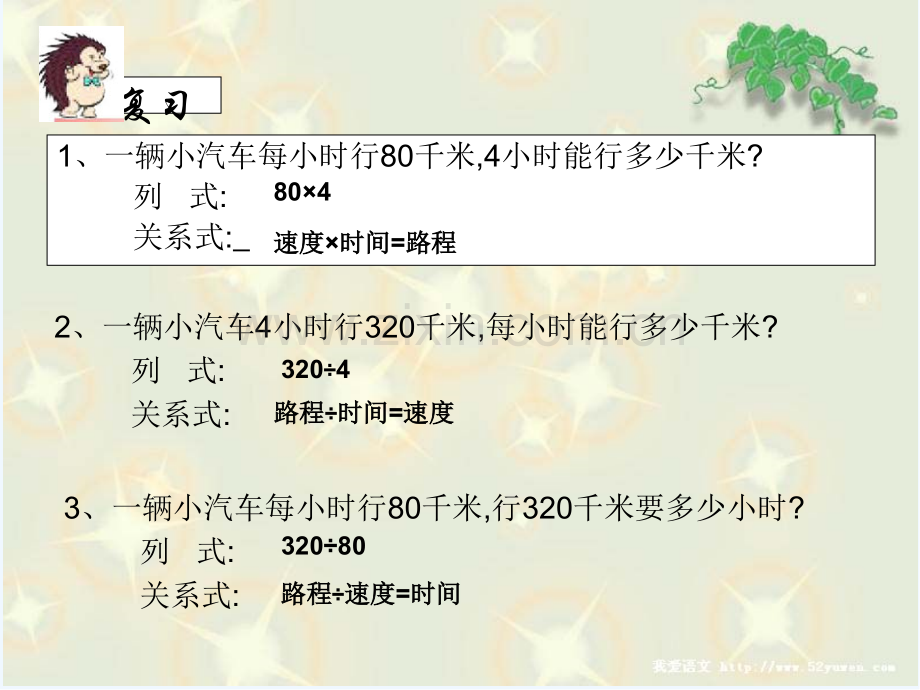 第七讲再学行程问题相遇与追及动画版详细复习1、一辆小汽车每小时行80千米,4小时能行多少千米?列 式:关系式:2、一辆小汽车4小时行320千米,每小时能行多少千米?列 式:关系式:3、一辆小汽车每小时行80千米,行320千米要多少小时?列 式:关系式:速度速度时间时间=路程路程804320432080路程路程时间时间=速度速度路程路程速度速度=时间时间郭郭庄庄天天桥桥李李村村遗遗址址公公园园 有几种办法有几种办法可以让王阿姨拿可以让王阿姨拿到材料呢到材料呢?3 3、两人同时出发、两人同时出发,在中途相遇在中途相遇后张叔叔把材料送给王阿姨后张叔叔把材料送给王阿姨1 1、王阿姨到天桥去取材、王阿姨到天桥去取材料料2 2、张叔叔把材料送给王阿姨、张叔叔把材料送给王阿姨王阿姨王阿姨张叔叔张叔叔 第一站 龟 兔 赛 跑 乌龟以每分乌龟以每分1010米得速度向终点跑去米得速度向终点跑去,小兔子小兔子在大树旁睡起了觉了在大树旁睡起了觉了,睡了睡了8282分钟瞧见乌龟正分钟瞧见乌龟正好到终点。好到终点。101082=820(82=820(米米)您知道大树离终点有多少米?您知道大树离终点有多少米?例例1例2:大树到终点得距离就是820米。乌龟跑到终点后发现小兔不见了,就马上以每分10米得速度往回跑。同时,小兔以每分400米得速度向终点跑去。它们要经过多少分钟相遇?820米兔子兔子乌龟乌龟 兔子与乌龟同时出发,同时到达。即:在相同得时间内走完了820米。相遇问题 关于相遇关于相遇,您就是怎么理解得?您就是怎么理解得?至少两个人至少两个人;要面对面运动。要面对面运动。如果说两人同时出发直如果说两人同时出发直到相遇到相遇,说明了什么说明了什么?两人所用得时间相同两人所用得时间相同、兔子得路程兔子得路程 乌龟得路程乌龟得路程 总路程总路程兔子得速度兔子得速度时间时间乌龟得速度乌龟得速度时间时间820820千米千米兔子用得时间乌龟用得时间兔子用得时间乌龟用得时间xx()()兔子得速度兔子得速度时间时间 乌龟得速度乌龟得速度时间时间 总路程总路程(兔子得速度兔子得速度 乌龟得速度乌龟得速度)时间时间 总路程总路程时间时间总路程总路程(兔子得速度兔子得速度 乌龟得速度乌龟得速度)乌龟以每分10米得速度往回跑。小兔以每分400米得速度向终点跑去。它们要经过多少分钟相遇?820米兔子兔子乌龟乌龟 相遇问题乌龟与兔子同时跑乌龟与兔子同时跑,每分钟共跑了每分钟共跑了_10+400=410(米)它们从开始跑到相遇花了多长时间?它们从开始跑到相遇花了多长时间?820410=2(分钟)速度与总路程速度与=相遇时间第二站 运动场上得追及大家有疑问的,可以询问和交流大家有疑问的,可以询问和交流可以互相讨论下,但要小声点可以互相讨论下,但要小声点可以互相讨论下,但要小声点可以互相讨论下,但要小声点 环形跑道长250米,小明每秒6米,小红每秒4米,她们从同一起点同方向出发。小明第一次追上小红时小明第一次追上小红时,刚好比小红多跑刚好比小红多跑_一圈一圈(即即250米米)每秒多跑每秒多跑2 2米米,一圈一圈250250米里面有多少个米里面有多少个2 2米米,就就是小明第一就就是小明第一次追上小红需要得时次追上小红需要得时间。间。6-4=2(米米)2502=125(秒秒)速度差追及问题1、要求追及时间,可以用(路程差)(速度差)2、环形跑道追及问题,快者比慢着多跑一圈第三站 上学路上 小明每分钟走80米,小玲每分钟走60米。小明走到学校门口发现忘带语文书,于就是沿路返回,行至离学校160米处与小玲相遇。她们家离学校有多远?小明小玲学校家160米相遇问题 相同时间内相同时间内,小明比小玲多走小明比小玲多走1602=320(米米)每分钟每分钟,小明比小玲多走小明比小玲多走 80-60=20(米米)她们从出门到相遇走了多长时间她们从出门到相遇走了多长时间 32020=16(分钟分钟)第四站 能干得鸽子 小明与小红两家相距1400米,她们同时从家出发去学校,相向而行。小明每分钟80米,小红每分钟60米。如果一只鸽子与小明同时同向出发每分钟飞行500米,这只鸽子遇到小红回头飞向小明,遇到小明又回头再飞向小红,一直不断来回,这只鸽子共飞行了多少米?小明小红鸽子小明与小玲共走了1400米鸽子飞行得时间就就是小明与小红相遇得时间大胆闯关一环湖公路,相背而行相 遇 问 题小明小明12千米千米/小时小时小芳小芳10千米千米/小时小时1.5小时相遇小时相遇总路程=相遇时间 速度与 1、5 (12 +10)=1、5 22=33(千米)大胆闯关二训练基地野外速滑队通信员12500=6000(米)追及路程 6000 (900-500)=6000 400=15(分钟)大胆闯关三500-(90+60)3 500+(90+60)3 500-60 3+90 3 500-90 3 +60 3(1)相向而行:(2)相背而行:(3)向左行:(4)向右行:小华小红小华小红小华小红小华小红大胆闯关四大胆闯关四甲乙自行车自行车甲队、乙队、骑自行车得同学所用时间一样,即甲与乙得相遇时间。18(5+4)=2(小时)142=28(千米)大胆闯关五大胆闯关五甲乙24千米相同时间内甲比乙多行了48千米一小时甲比乙多行多少千米?90 -82=8(千米)48 8 =6(小时)6(90+82)=1032(千米)关键:出发时得位置(同地、异地)就是否同时出发 出发得方向(相向、同向、相背)课后习题一课后习题一 A地 同时 相背 小王与小张得距离会 发生什么样得变化呢?