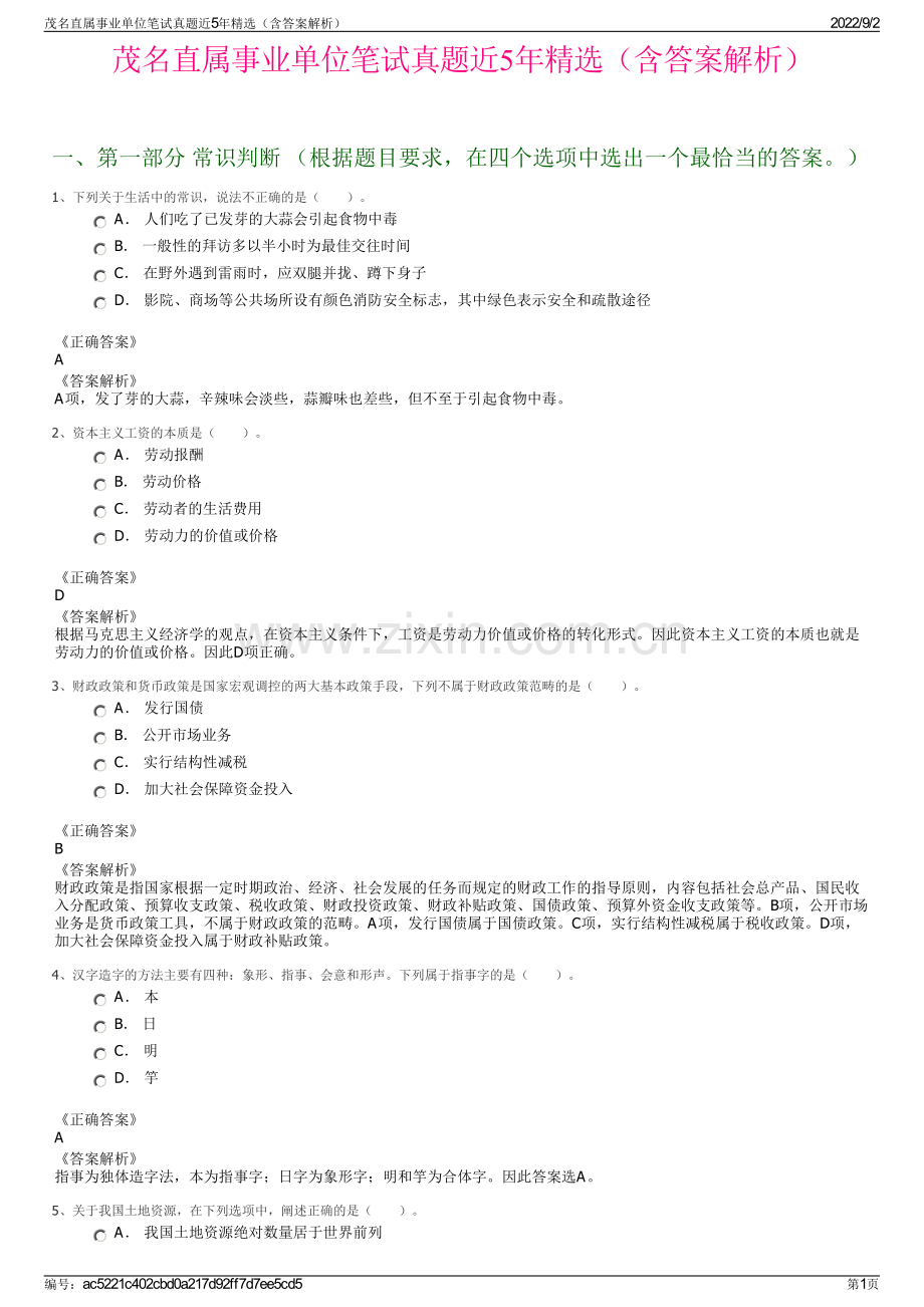 茂名直属事业单位笔试真题近5年精选(含答案解析)一、第一部分 常识判断 (根据题目要求,在四个选项中选出一个最恰当的答案。)1、下列关于生活中的常识,说法不正确的是()。 A 人们吃了已发芽的大蒜会引起食物中毒 B 一般性的拜访多以半小时为最佳交往时间 C 在野外遇到雷雨时,应双腿并拢、蹲下身子 D 影院、商场等公共场所设有颜色消防安全标志,其中绿色表示安全和疏散途径正确答案A答案解析A项,发了芽的大蒜,辛辣味会淡些,蒜瓣味也差些,但不至于引起食物中毒。2、资本主义工资的本质是()。 A 劳动报酬 B 劳动价格 C 劳动者的生活费用 D 劳动力的价值或价格正确答案D答案解析根据马克思主义经济学的观点,在资本主义条件下,工资是劳动力价值或价格的转化形式。因此资本主义工资的本质也就是劳动力的价值或价格。因此D项正确。3、财政政策和货币政策是国家宏观调控的两大基本政策手段,下列不属于财政政策范畴的是()。 A 发行国债 B 公开市场业务 C 实行结构性减税 D 加大社会保障资金投入正确答案B答案解析财政政策是指国家根据一定时期政治、经济、社会发展的任务而规定的财政工作的指导原则,内容包括社会总产品、国民收入分配政策、预算收支政策、税收政策、财政投资政策、财政补贴政策、国债政策、预算外资金收支政策等。B项,公开市场业务是货币政策工具,不属于财政政策的范畴。A项,发行国债属于国债政策。C项,实行结构性减税属于税收政策。D项,加大社会保障资金投入属于财政补贴政策。4、汉字造字的方法主要有四种:象形、指事、会意和形声。下列属于指事字的是()。 A 本 B 日 C 明 D 竽正确答案A答案解析指事为独体造字法,本为指事字;日字为象形字;明和竽为合体字。因此答案选A。5、关于我国土地资源,在下列选项中,阐述正确的是()。 A 我国土地资源绝对数量居于世界前列茂名直属事业单位笔试真题近5年精选(含答案解析)2022/9/2编号:ac5221c402cbd0a217d92ff7d7ee5cd5第1页 B 我国以农业立国,耕地面积比重比较大 C 我国人均土地资源居世界前列,排在俄罗斯、加拿大、澳大利亚和美国之后 D 耕地后备资源多,95%集中在西北和东北地区正确答案A答案解析中国土地资源,总体上有四大特点:山地多、平地少、耕地比重小,其中耕地约占国土总面积的10.4%左右,且有不断减少的趋势;土地资源绝对量大,人均量少;土地资源分布不平衡,土地生产力地区差异大;耕地后备资源少,难利用的土地多。因此A项正确。6、人类食用的植物中许多含有天然有毒物质,如果误食,就有可能中毒。下列食品中没有毒性的是()。 A 青西红柿 B 干黄花菜 C 鲜木耳 D 苦杏仁正确答案B答案解析B项正确,鲜黄花菜中含有秋水仙碱,秋水仙碱会引起食用者出现咽喉发干、恶心呕吐等现象,干黄花菜经过蒸煮洗晒等加工,已除掉大部分的秋水仙碱,无毒,一般可以放心食用。A项错误,青西红柿含有龙葵碱,未熟的青西红柿吃了常感到不适,轻则口腔感到苦涩,严重的时候会出现中毒现象;C项错误,鲜木耳中含有一种叫卟啉的光感物质,人食用后,皮肤对光敏感性大大增加,因而容易患日光性皮炎、皮疹等疾病,如果食用过多,会引起呼吸道黏膜过敏而发生呼吸困难;D项错误,苦杏仁的毒性来自于苦杏仁苷水解释放出的氢氰酸,这种物质可以阻断细胞的呼吸链,人过量服用苦杏仁可中毒。7、在现代管理学中,管理人员对当前的实际工作是否符合计划而进行测定并促使组织目标实现的过程,被称为()。 A 领导 B 组织 C 创新 D 控制正确答案D答案解析D项正确,控制是根据组织的计划和事先规定的标准,监督检查各项活动及其结果,并根据偏差或调整行动或调整计划,使计划和实际相吻合,保证目标实现。8、甲、乙二人携带炸药去水库僻静处炸鱼,甲在岸边准备往水中掷炸药时,不慎引起爆炸,将乙炸死,自己也受重伤。则甲的行为如何定性?() A 过失爆炸罪 B 过失致人死亡罪 C 意外事件 D 非法捕捞水产品罪正确答案B答案解析过失致人死亡罪是指因过失而致人死亡的行为。炸药爆炸将乙炸死,甲的主观心态是因为疏忽大意没有预见,其行为构成过失致人死亡罪。9、丹霞地貌是指由陆相红色砂砾岩构成的具有陡峭坡面的各种地貌形态。以下景观属于丹霞地貌的是()。 A 新疆克拉玛依魔鬼城 B 江西龙虎山 C 广东肇庆七星岩 D 湖南张家界茂名直属事业单位笔试真题近5年精选(含答案解析)2022/9/2编号:ac5221c402cbd0a217d92ff7d7ee5cd5第2页正确答案B答案解析B项正确,江西龙虎山属于丹霞地貌,指由产状水平或平缓的层状铁钙质混合不均匀胶结而成的红色碎屑岩,受垂直或高角度节理切割,并在差异风化、重力崩塌、流水溶蚀、风力侵蚀等综合作用下形成的有陡崖的城堡状、宝塔状、针状、方山状或峰林状的地形。A项错误,新疆克拉玛依魔鬼城属于雅丹地貌,雅丹地貌是指由于风的磨蚀作用,小山包的下部遭受较强的剥蚀,逐渐向里凹,上部在重力作用下垮塌形成陡壁。C项错误,广东肇庆七星岩属于喀斯特地貌,喀斯特地貌是指具有溶蚀力的水对可溶性岩石进行溶蚀所形成的地表和地下形态的总称。D项错误,属于张家界地貌,张家界地貌是指特征鲜明、规模巨大的独特砂岩地貌。10、下列各项政府行为中,属于经济手段的是()。 A 制定食品安全法规 B 关闭污染严重的企业 C 中央银行提高存款准备金率 D 质