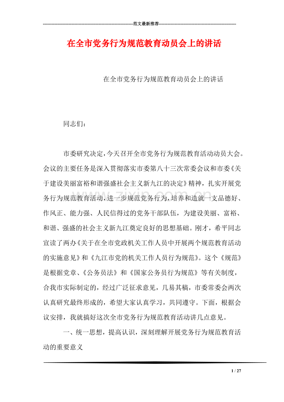 市委研究决定,今天召开全市党务行为规范教育活动动员大会。会议的主要任务是深入贯彻落实市委第八十三次常委会议和市委《关于建设美丽富裕和谐强盛社会主义新九江的决定》精神,扎实开展党务行为规范教育活动,进一步规范党务行为,培养和造就一支品德好、作风正、能力强、人民信得过的党务干部队伍,为建设美丽、富裕、和谐、强盛的社会主义新九江奠定良好的思想基础。刚才,希平同志宣读了两办《关于在全市党政机关工作人员中开展两个规范教育活动的实施意见》和《九江市党的机关工作人员行为规范》。这个《规范》是根据党章、《公务员法》和《国家公务员行为规范》等有关制度,合我市实际制定的,经过广泛征求意见,几易其稿,市委常委会两次认真研究最终形成的,希望大家认真学习,共同遵守。下面,根据会议安排,我就搞好这次全市党务行为规范教育活动讲几点意见。