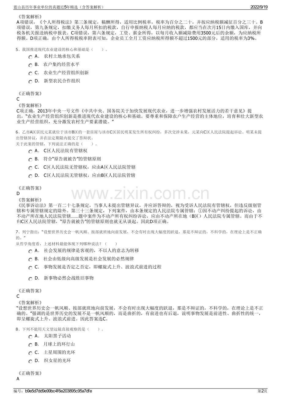 蓝山县历年事业单位的真题近5年精选(含答案解析)一、第一部分 常识判断 (根据题目要求,在四个选项中选出一个最恰当的答案。)1、下列关于生产者物价指数(PPI)和消费者物价指数(CPI)的说法,正确的是()。 A 我国CPI的统计范围包括食物、交通通讯、居民购房消费等八大类 B 当PPI指数增幅很大而且持续加速上升时,该国央行应该采取减息对策 C 消费者物价指数(CPI)是一个滞后性数据 D PPI反映生产环节价格水平,CPI反映消费环节的价格水平,因此,根据价格传导规律,CPI不会对PPI产生影响正确答案C答案解析A项错误,我国CPI的统计范围包括食品、烟酒及用品、衣着、家庭设备用品及服务、医疗保健及个人用品、交通和通信、娱乐教育文化用品及服务、居住八大类。但居住消费大类中并不包括居民购房消费。B项错误,当PPI指数增幅很大而且持续加速上升时,该国央行应该采取加息对策,防止通货膨胀。D项错误,一般来说,PPI对CPI进行正向传导,在特殊情况下,PPI与CPI之间还存在后者向前者的逆向传导。C项正确,CPI表示对普通家庭的支出来说,购买具有代表性的一组商品,在今天要比过去某一时间多花费多少,是一个滞后性的数据,但它往往是市场经济活动与政府货币政策的一个重要参考指标。2、调查研究的基本程序可以分为四个环节,即准备工作、调查工作、研究工作和()。 A 总结工作 B 报告工作 C 宣传工作 D 文档工作正确答案A答案解析A项正确,调查研究是人们深入现场进行考察,以探求客观事物的真相、性质和发展规律的活动。其基本程序可分为准备工作、调查工作、研究工作和总结工作。3、下列关于行政决策的表述,不正确的是()。 A 决策过程中最核心、最关键的一步是评估方案,作出决策 B 提高行政效率是行政决策科学化的重要前提 C 行政决策是履行行政管理职能的中心环节 D 在程序化决策和非程序化决策之间,领导者往往更应集中精力作好非程序化决策正确答案B答案解析行政决策科学化前提是采用先进的决策技术和方法,按照科学决策的原则和程序进行决策。4、2011年9月1日,修订后的个人所得税法正式施行。下列关于个人所得税法的说法,正确的是()。 A 稿酬所得,适用比例税率,税率为百分之二十,并按应纳税额减征百分之二十 B 扣缴义务人每月所扣的税款,自行申报纳税人每月应纳的税款,都应当在次月7日内缴入国库,并向税务机关报送纳税申报表 C 工资、薪金所得,以每月收入额减除费用3000元后的余额,为应纳税所得额 D 企业员工全月工资应纳税所得额不超过1500元的部分,适用的税率为3%正确答案D蓝山县历年事业单位的真题近5年精选(含答案解析)2022/9/19编号:b9e5d7dd9e99bc4f6e203895c95a7dfe第1页答案解析A项错误,个人所得税法第三条规定,稿酬所得,适用比例税率,税率为百分之二十,并按应纳税额减征百分之三十。B项错误,第九条规定,扣缴义务人每月所扣的税款,自行申报纳税人每月应纳的税款,都应当在次月15日内缴入国库,并向税务机关报送纳税申报表。C项错误,第六条规定,工资、薪金所得,以每月收入额减除费用3500元后的余额,为应纳税所得额。D项正确,由个人所得税税率附表可知,企业员工全月工资应纳税所得额不超过1500元的部分,适用的税率为3%。5、我国推进现代农业建设的核心和基础是()。 A 农村土地承包关系 B 农户集约经营水平 C 农业生产经营组织创新 D 新型农民合作组织正确答案C答案解析C项正确,2013年中央一号文件中共中央、国务院关于加快发展现代农业,进一步增强农村发展活力的若干意见提出,“农业生产经营组织创新是推进现代农业建设的核心和基础。要尊重和保障农户生产经营的主体地位,培育和壮大新型农业生产经营组织,充分激发农村生产要素潜能。”6、乙市A区居民元某就位于该市B区的一套房屋与该市C区居民明某发生所有权纠纷,多次交涉未果,元某向C区人民法院提起诉讼。明某未提出管辖异议,并在法定期限内提交了答辩状。关于此案的管辖,下列说法正确的是()。 A C区人民法院有管辖权 B 符合“原告就被告”的管辖原则 C C区人民法院无管辖权,应由A区人民法院管辖 D C区人民法院无管辖权,应由B区人民法院管辖正确答案D答案解析民事诉讼法第一百二十七条规定,当事人未提出管辖异议,并应诉答辩的,视为受诉人民法院有管辖权,但违反级别管辖和专属管辖规定的除外。第三十三条规定,下列案件,由本条规定的人民法院专属管辖:因不动产纠纷提起的诉讼,由不动产所在地人民法院管辖题中案件为不动产所有权纠纷诉讼,应由不动产所在地(B区)人民法院专属管辖。而由于不归C区人民法院管辖,“原告就被告”的管辖原则也就无从谈起。因此D项正确。7、列宁指出:“设想世界历史会一帆风顺、按部就班地向前发展,不会有时出现大幅度的跃退,那是不辩证的,不科学的,在理论上是不正确的。”从哲学角度看,上述材料最能体现下列哪种说法?() A 社会发展的规律是客观的,不以人的意志为转移 B 社会由低级向高级发展是社会发展的必然规律 C 事物发展是否定之否定,即螺旋式上升、波浪式前进的过程 D 新事物必然会战胜旧事物正确答案C答案解析“设想世界历史会一帆风顺、按部就班地向前发展,不会有时出现大幅度的跃退,那是不辩证的,不科学的,在理论上是不正确的。”强调的是世界历史的发展不是一帆风顺的,而
