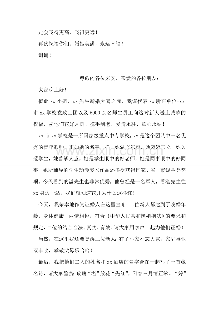 值此xx小姐、xx先生新婚大喜之际,我谨代表xx所在单位-xx市xx学校党政工团以及5000余名师生员工向这对新人送上诚挚的祝福,祝他们花好月圆、携手到老、爱情永驻、童心永结!