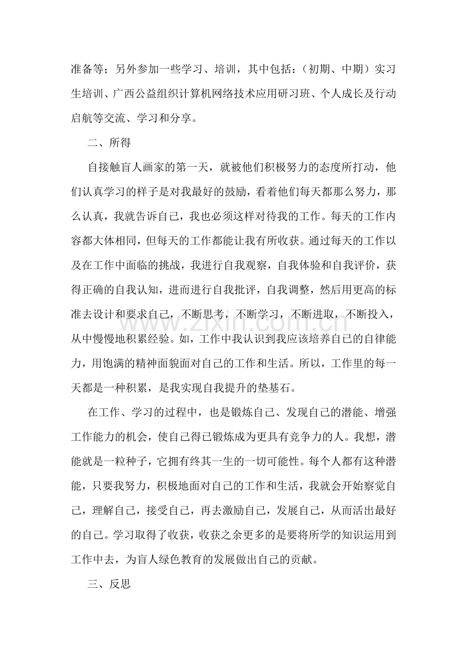 转眼间,参加青年实习生小额基金项目将近一年,马上就要毕业了,在这一年的工作中我学到了不少在社会上学不到的知识和经验。在机构里,我的工作是盲人绿色教育项目(绿色盲人绘画教育),带领盲人学生们体验农村生活和自然种植,让盲人学生体会植物成长的每一个阶段,从中学习盲画源于生活,高于生活的学习理念。这不但是一个协助盲人寻找光明的过程;也是我自己寻找光明前程的过程;更是帮助更多人寻到内心的光明的过程!这一年里,对工作由陌生到熟悉,由不适应到适应,这个过程有痛苦但更有快乐,因为工作,我每天都都能感觉到日子的充实和丰盈。在这个过程中,我付出并收获着、感恩并快乐着。