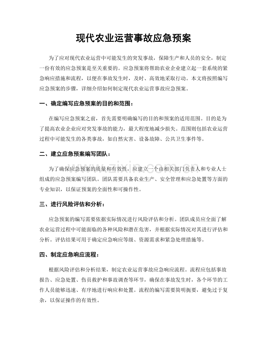 总之,制定一份现代农业运营事故应急预案是保障生产和人员安全的必要举措。通过按照以上步骤进行编写,能够使预案具备准确性、清晰性和有效性,为农业企业应对突发事故提供有力支持和指导。