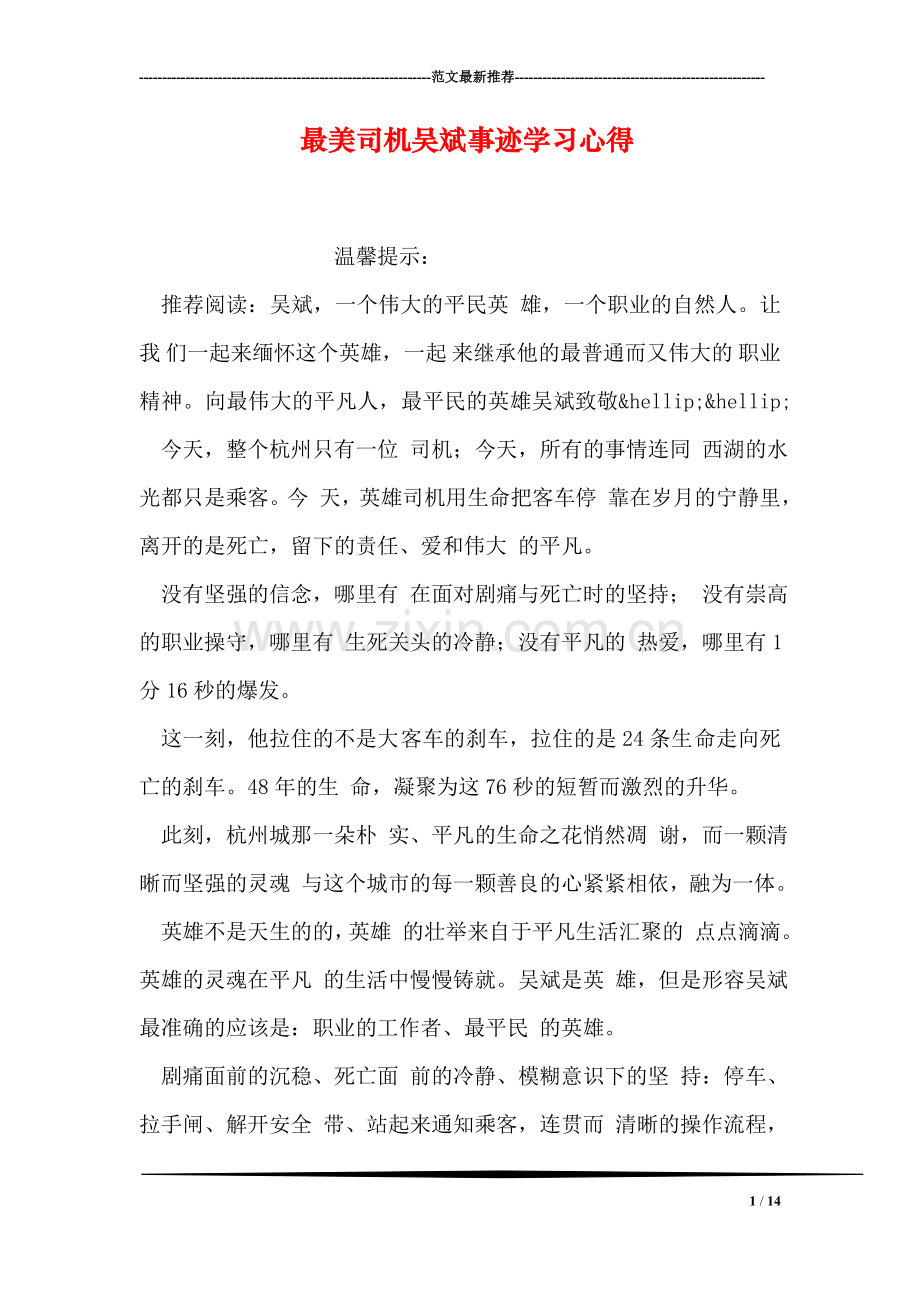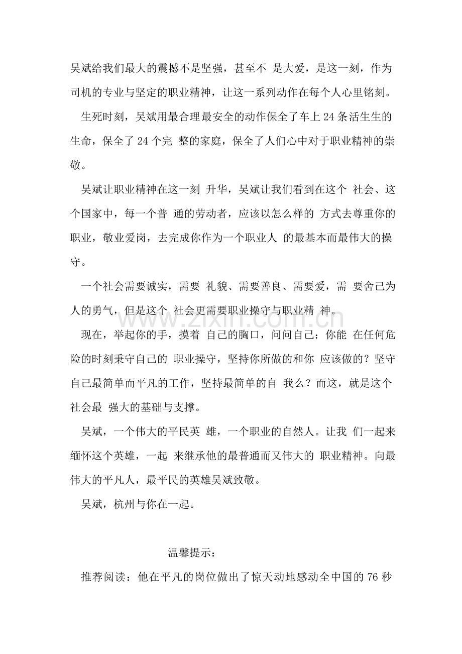吴斌同志是我们广大司机学习的楷模,在危急的关头,他以自己的生命诠释了一位英雄的壮举,我们学习他忠于职守,尽职尽责,视乘客的安全为生命的舍已忘我的精神,体现了平凡的岗位体现不平凡的担当,平凡的生命孕育伟大的灵魂。这些平凡岗位上的人,用实际行动展现了高尚的道德品质,用舍己为人的英雄壮举阐释了崇高的职业道德,用鲜血和生命践行了普通岗位的神圣职责。
